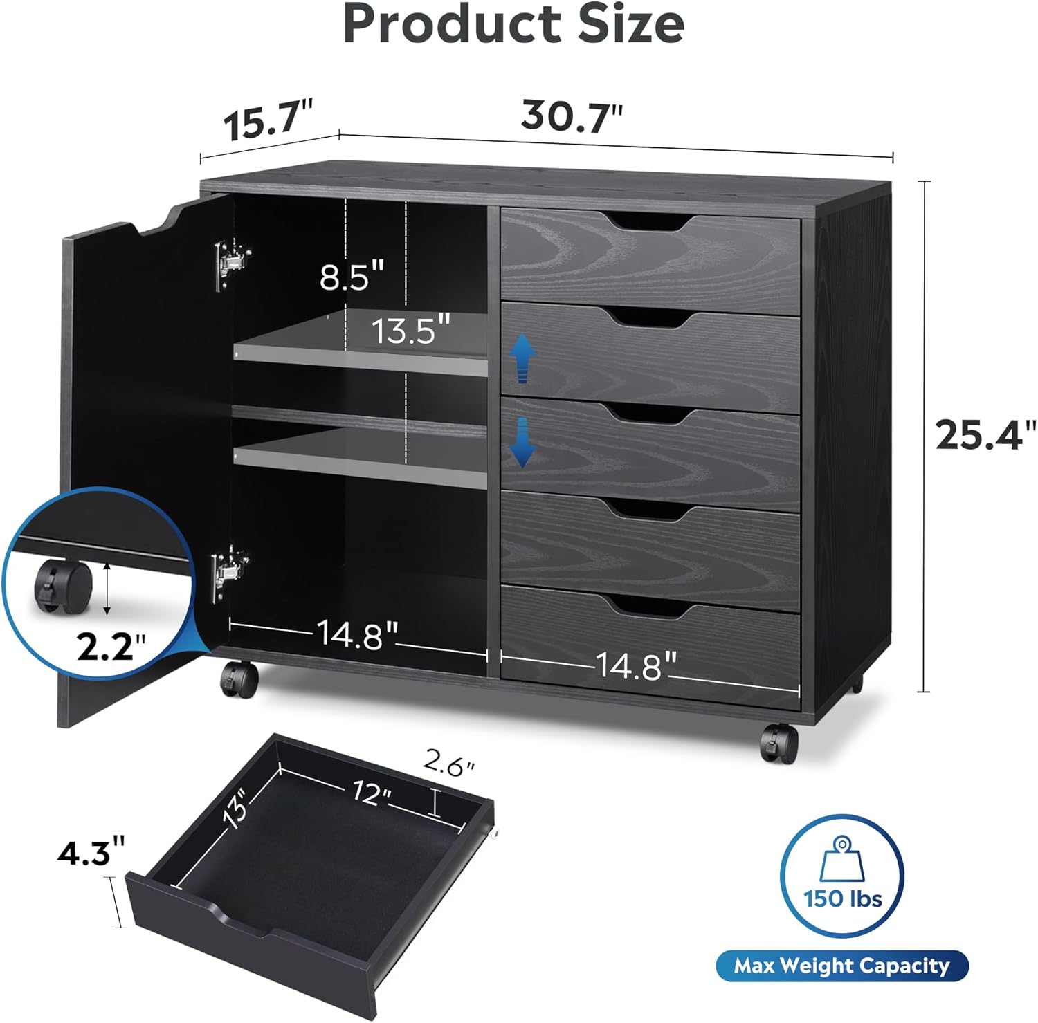 DEVAISE 5-Drawer Wood Dresser Chest with Door, Mobile Storage Cabinet, Printer Stand for Home Office, Black