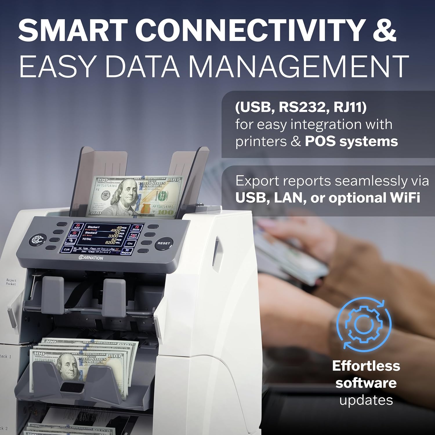 - Multi-Currency Support for Up to 128 Currencies: This money machine supports seamless counting of up to 128 currencies, including USD, CAD, BRL, and MXN, making it ideal for businesses handling various denominations.