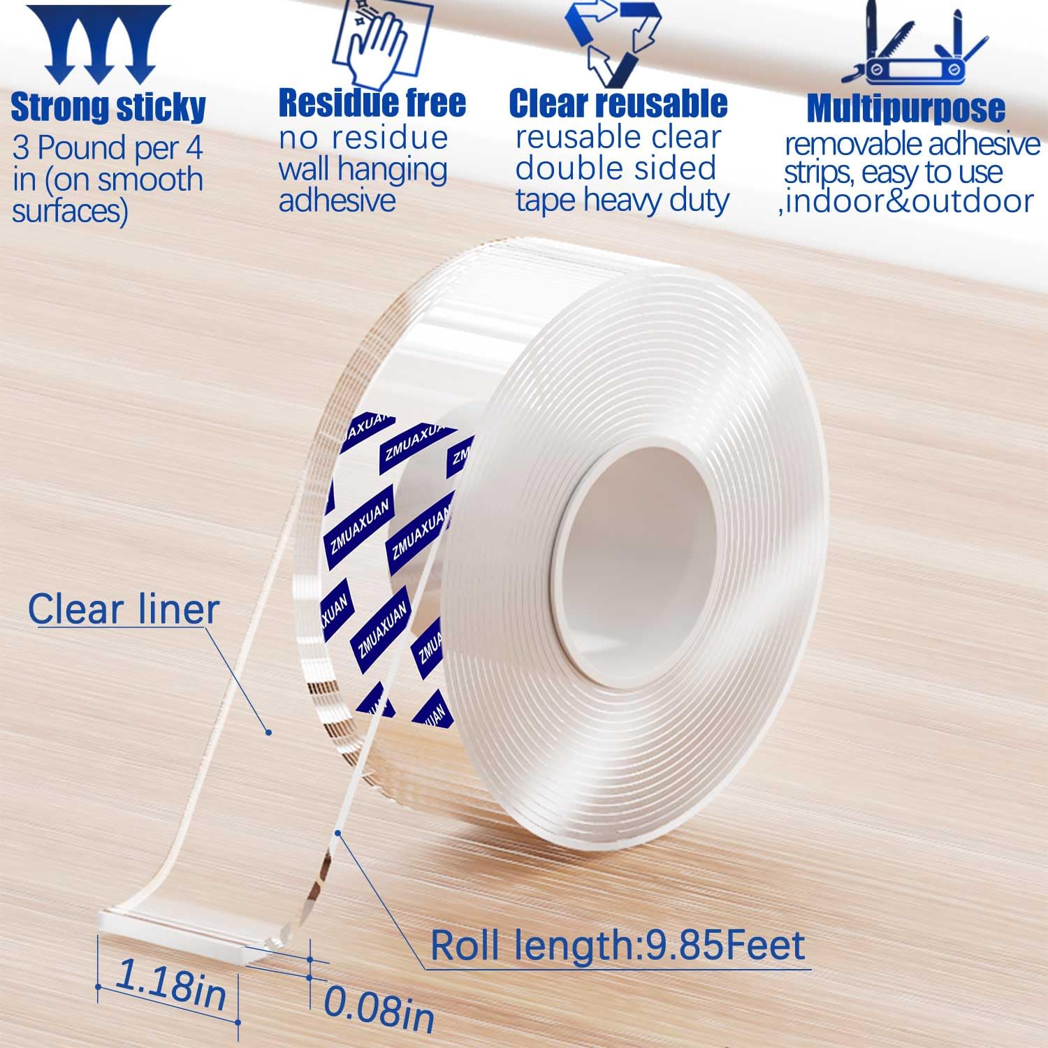 - ā REUSABLE&WASHABLEā Transparent removable mounting tape, easy to tear off from the surface of the object, clear&traceless. no damage to the surface. when the tape needs to be reused, rinse the surface with cold water and let it dry naturally, its stickiness will be restored immediately.