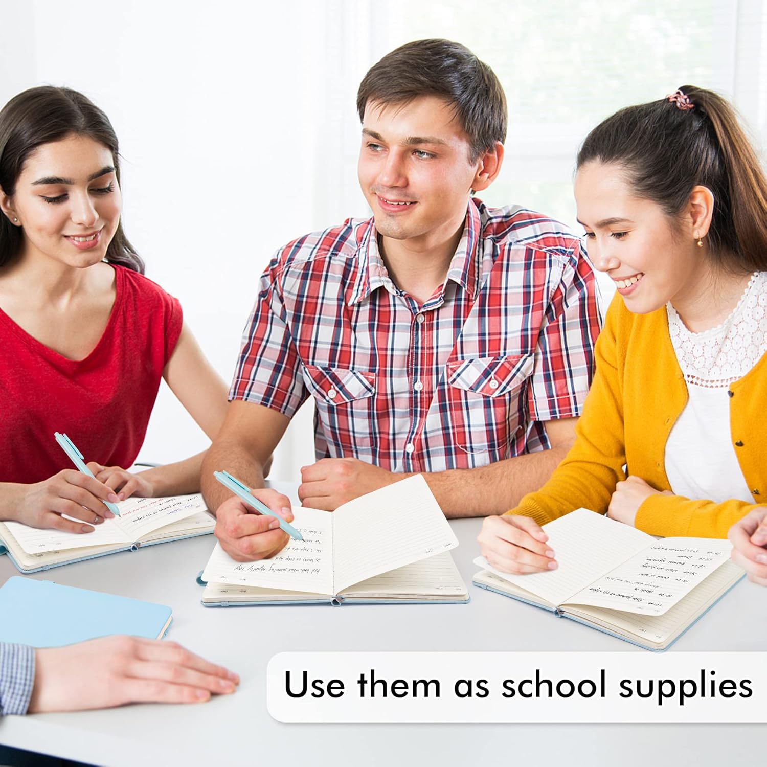 - Feela 5 Pack Classic Ruled Notebooks contains 5 classic light blue ruled sturdy cover notebooks and 5 Black Retractable Pens. Each of the notebooks measures 8.3” x 5.1”, which is perfect to carry and easily held by young girls and boys. These black cute pens are customized to be placed in the pen holder, which is pretty convenient.