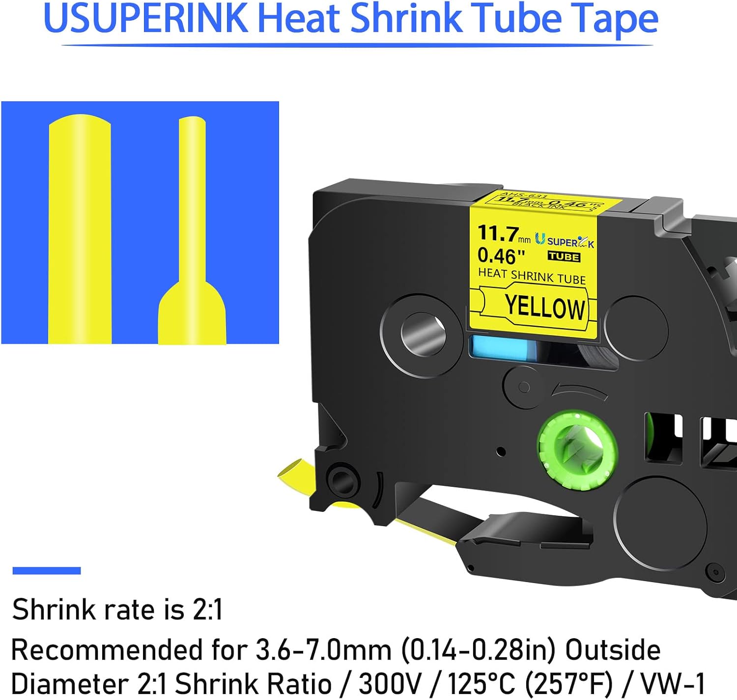 - USUPERINK HSe-631 Heat Shrink Tubes label tapes are perfect to mark cables,fibers and wires and can be used for cables in diameter 3.6mm (0.14 inch) and 7.0mm (0.28 inch).