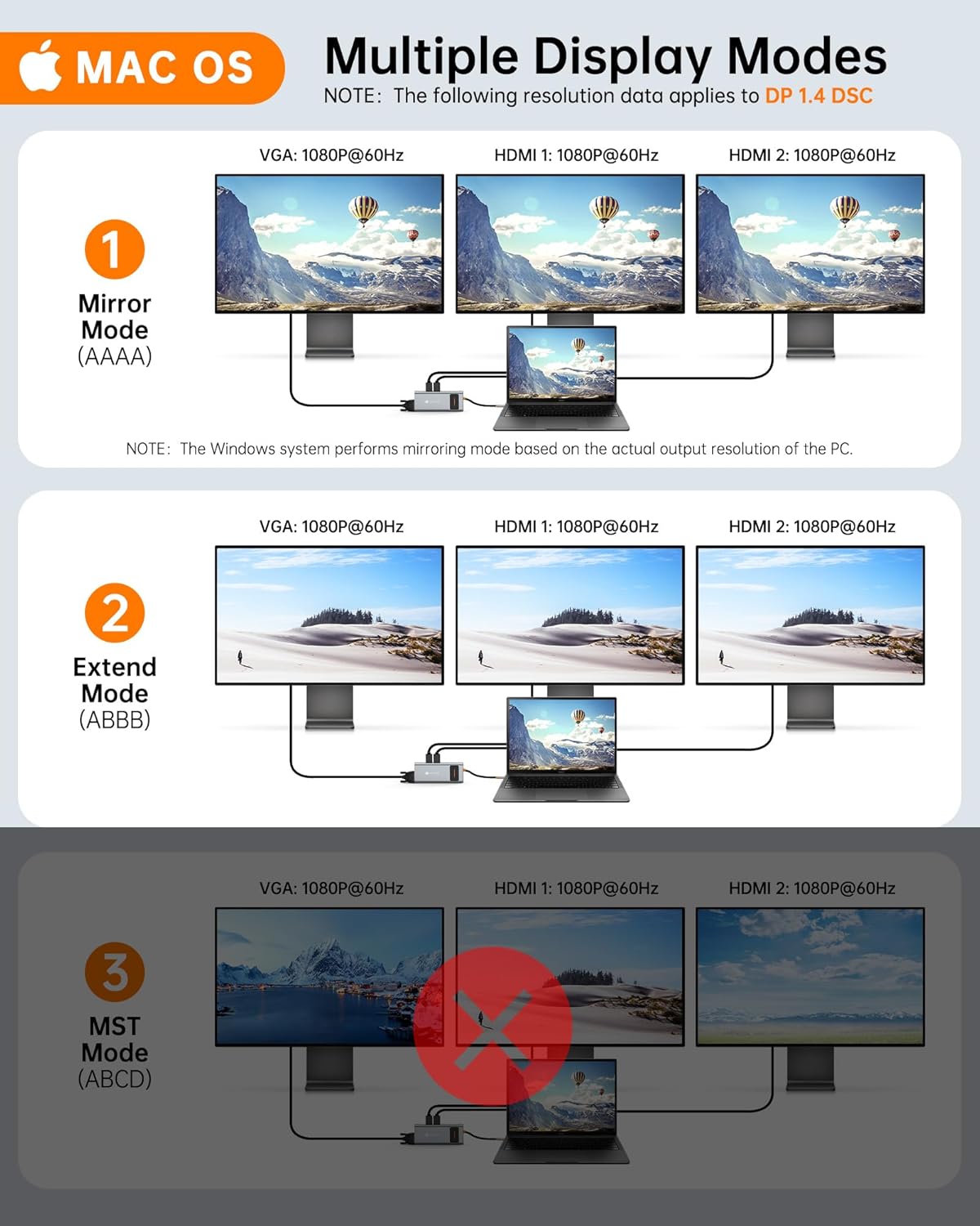- Docking Station Dual Monitor: Dell docking station will help you easily achieve dual-monitor and triple-monitor display, making your work/life more efficient;( Triple Display 2 HDMI 4KVGA 1080P) ★Please Note Before Purchase: Only the built-in usb c port of your laptop is the fully functional port, you can use the dual/triple monitor function if you are not sure, please send the laptop model and we will help you to check if this docking station is compatible for your device
