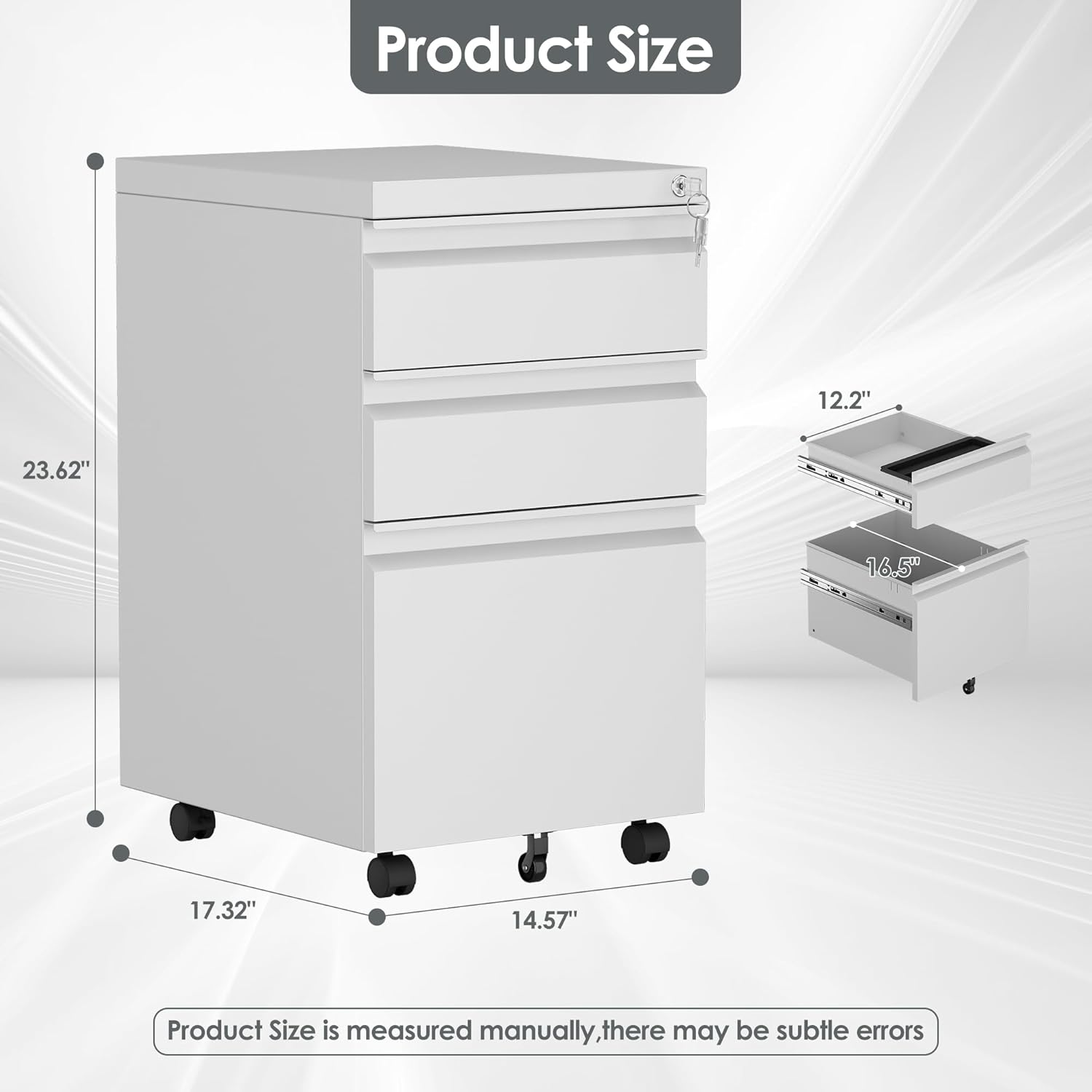 3 Drawer Mobile File Cabinet with Lock, Under Desk Metal Filing Cabinet for Office,Home,A4/Legal/Letter Size, Fully Assembled (White)