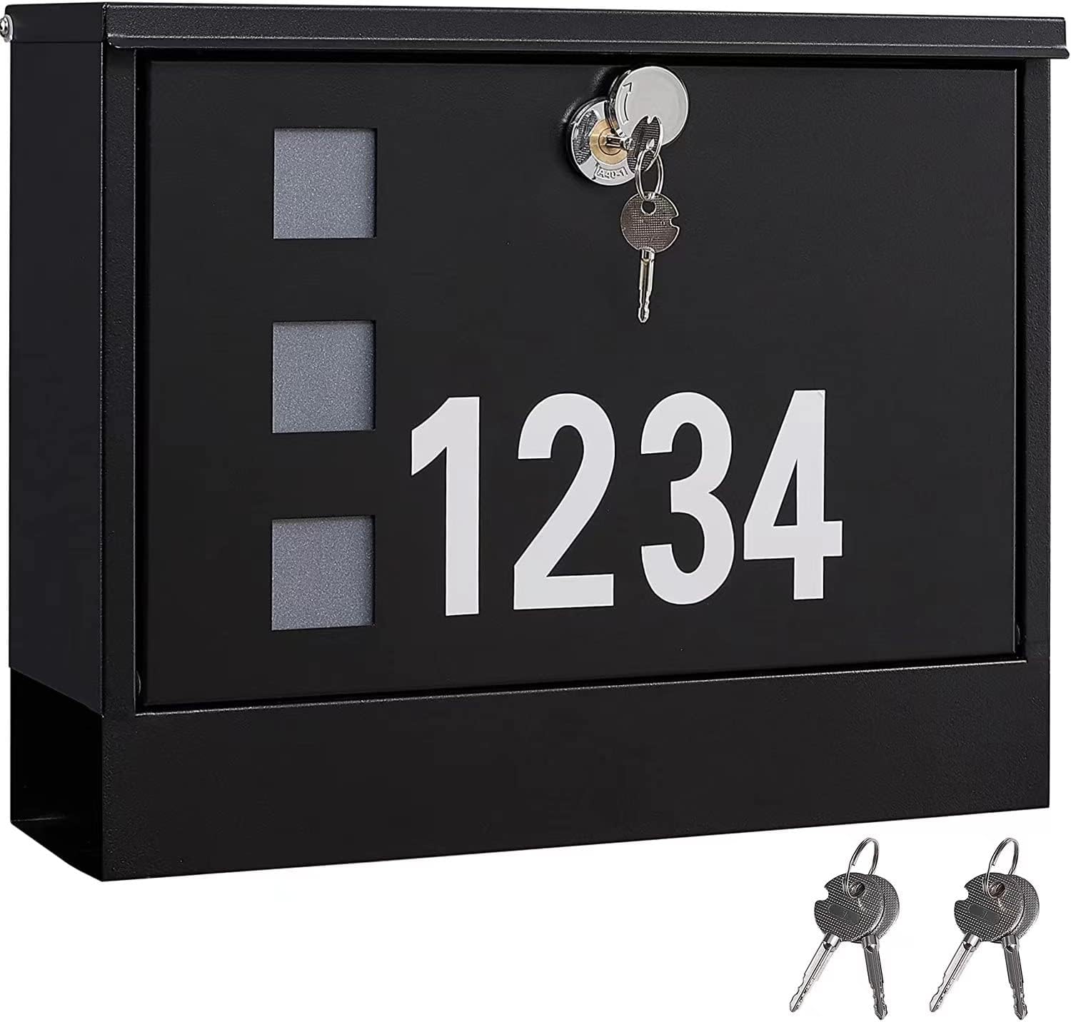 LAND·VOI Locking Mailbox Wall Mounted, Metal Postbox with Three Sets of Mail Box Number Stickers, 4 Keys, 14.4" x 4.5" x 11.2", Large Capacity, Black, AMB11B