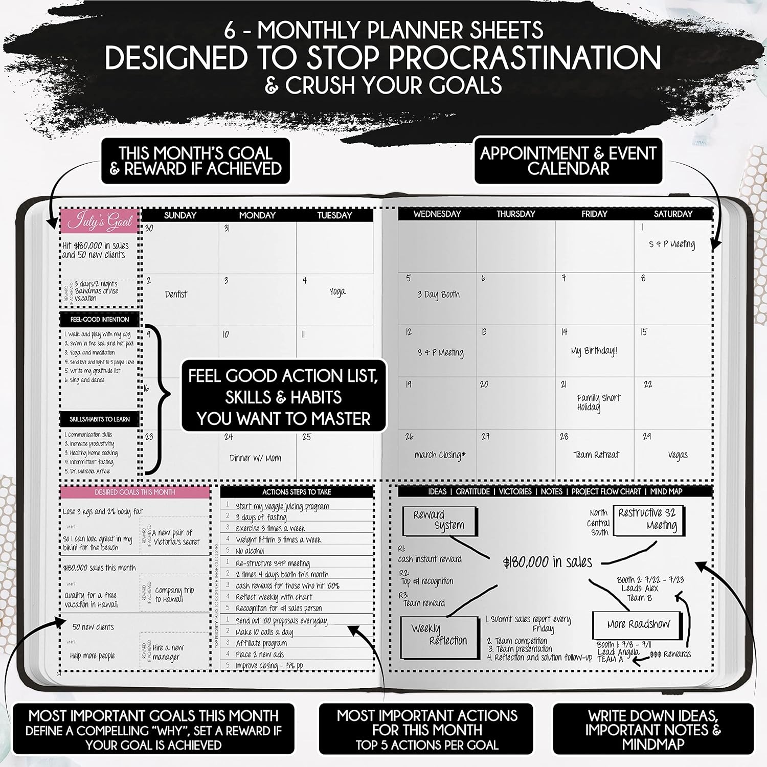 - ADHD PLANNER FOR ADULTS - This deluxe daily planner and self-care journal comes in A5 size (5.8 x 8.3 inches). The life planner comprises 264 pages of thick 100 gsm paper, including 90 daily planning sheets, guiding you on how to become the best possible version of yourself on a mental, physical, and interpersonal level. It's a unique diary based on leading scientific studies proven to increase productivity and happiness. The journal features an out-foldable vision board to help you stay focused, morning and evening power questions, mind maps, reflection pages, habit trackers, a back pocket, and much more than any other planner on the market!