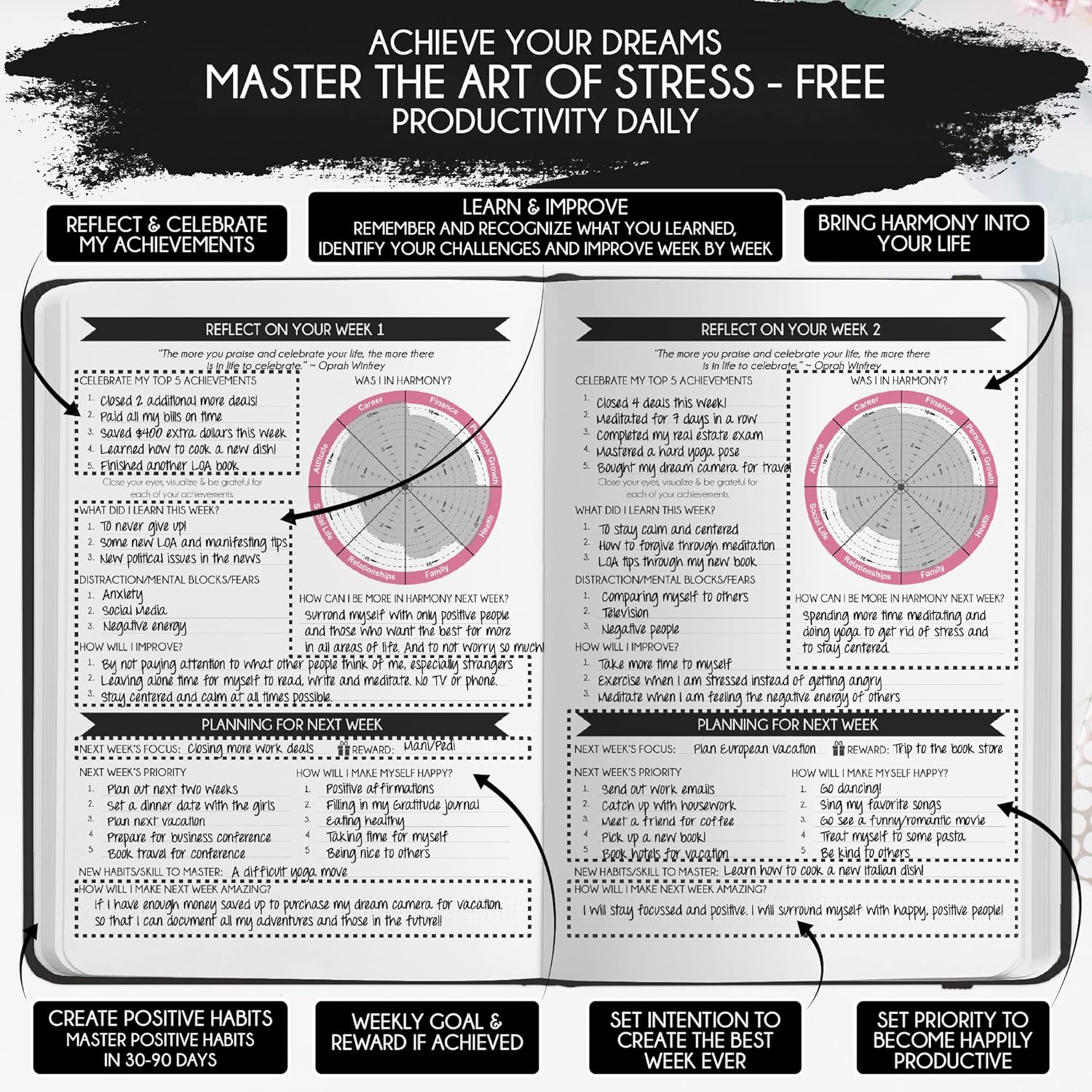 - LUXURIOUS AND TOP QUALITY - Self-care journal for women and men, perfect for entrepreneurs, professionals, college students and everyone who has burning desire to turn dreams into reality! FREE VIDEO MINI-COURSE: You will learn 10-min morning routine used by the most successful people to 10-fold your productivity, focus, happiness & passion! You will master setting goals & fix procrastination!
