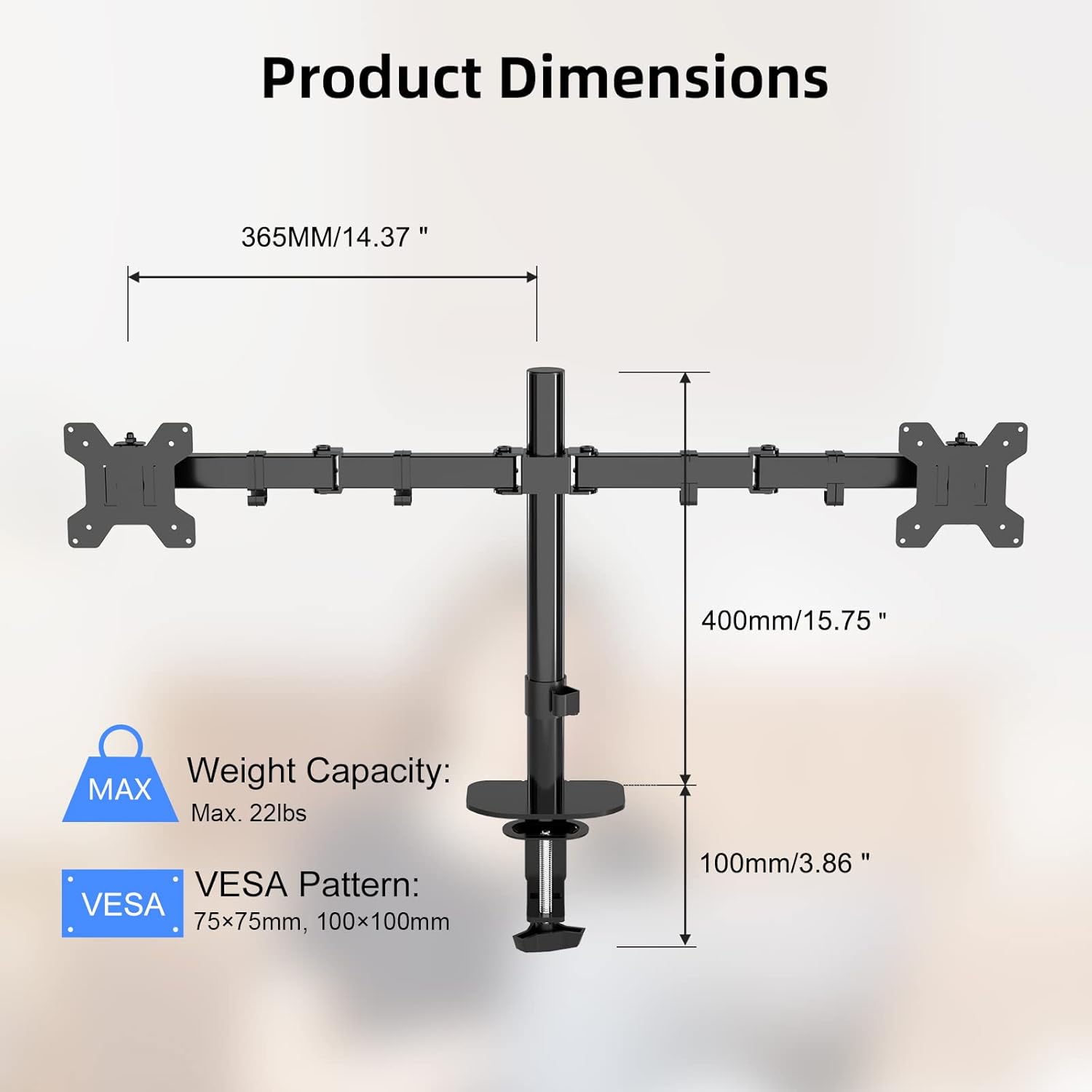 - GREAT MONITOR ARM: This dual monitor mount fits screens that weigh up to 22 lbs with backside mounting (VESA 75x75mm or 100x100mm). This monitor arms for 2 monitors covers most monitors on the market between 13 inch and 38 inch. Compatible with ASUS, Acer, Samsung, LG, HP, AOC, Dell, Lenovo, etc., including but not limited to38 32 27 25 24 23 22 21 20 19 17 13 inch screen.