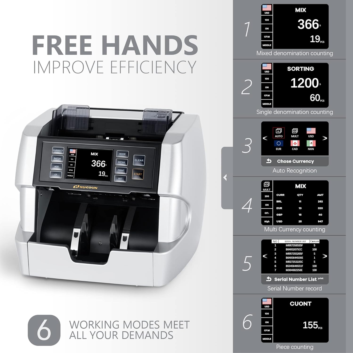 - ✅ Reliable Cash Protector: VC-7 Silver Mixed denomination currency counter has 2CIS, UV, MG, IR, MT sensors to detect bill’s authenticity. It counts the quantity, reads the denomination and currency, calculate the total amount at one time pass. Turn on serial number reading function to record serial number and, All the counting details can be printed directly or exported to PC, very helpful for money tracking.