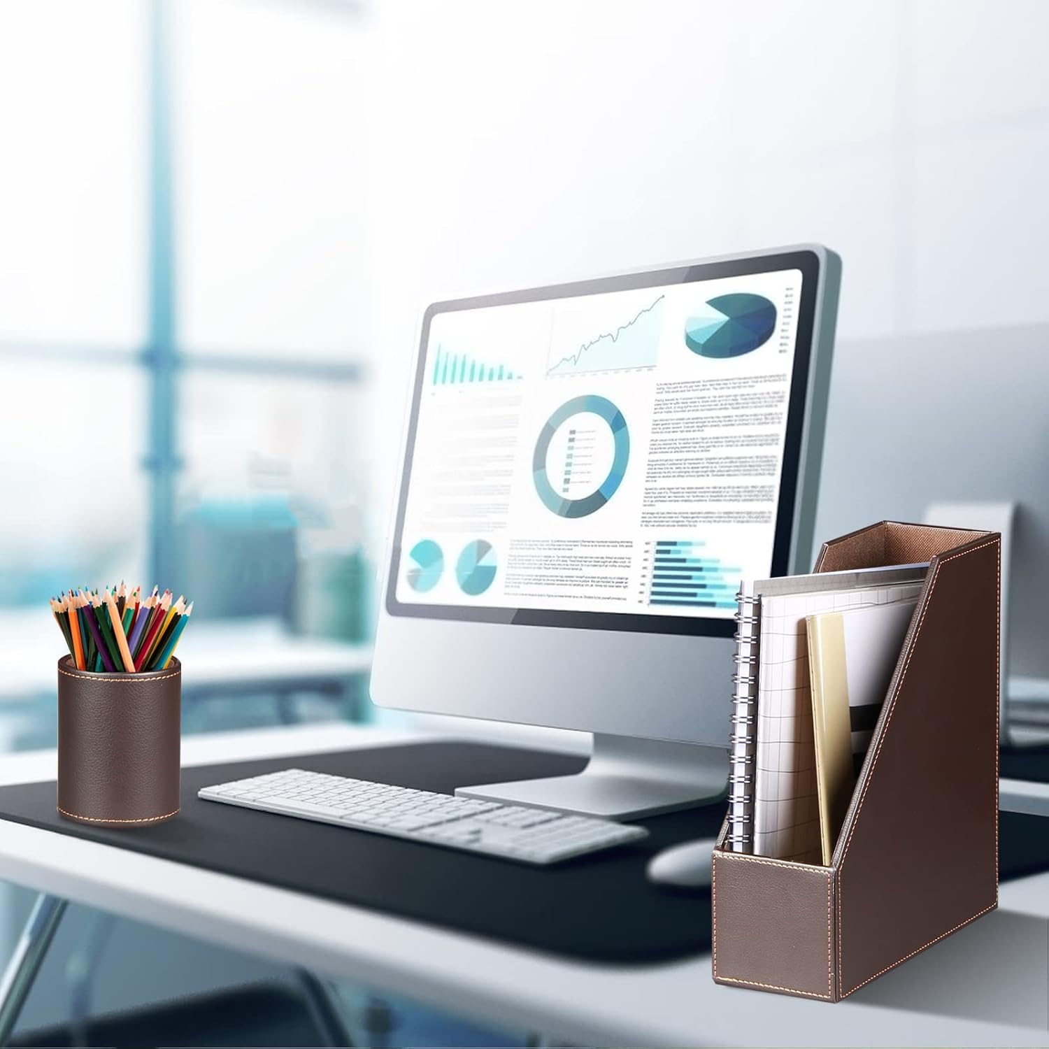 - / MODERN DESK ORGANIZER: Waterproof surface and easy to clean. solid MDF construction with premium PU leather , streamlined stitching and soft lining prevent items from scratch. Practical and decorative desk caddy sets for home, office, business, school dorm or kid's study table.