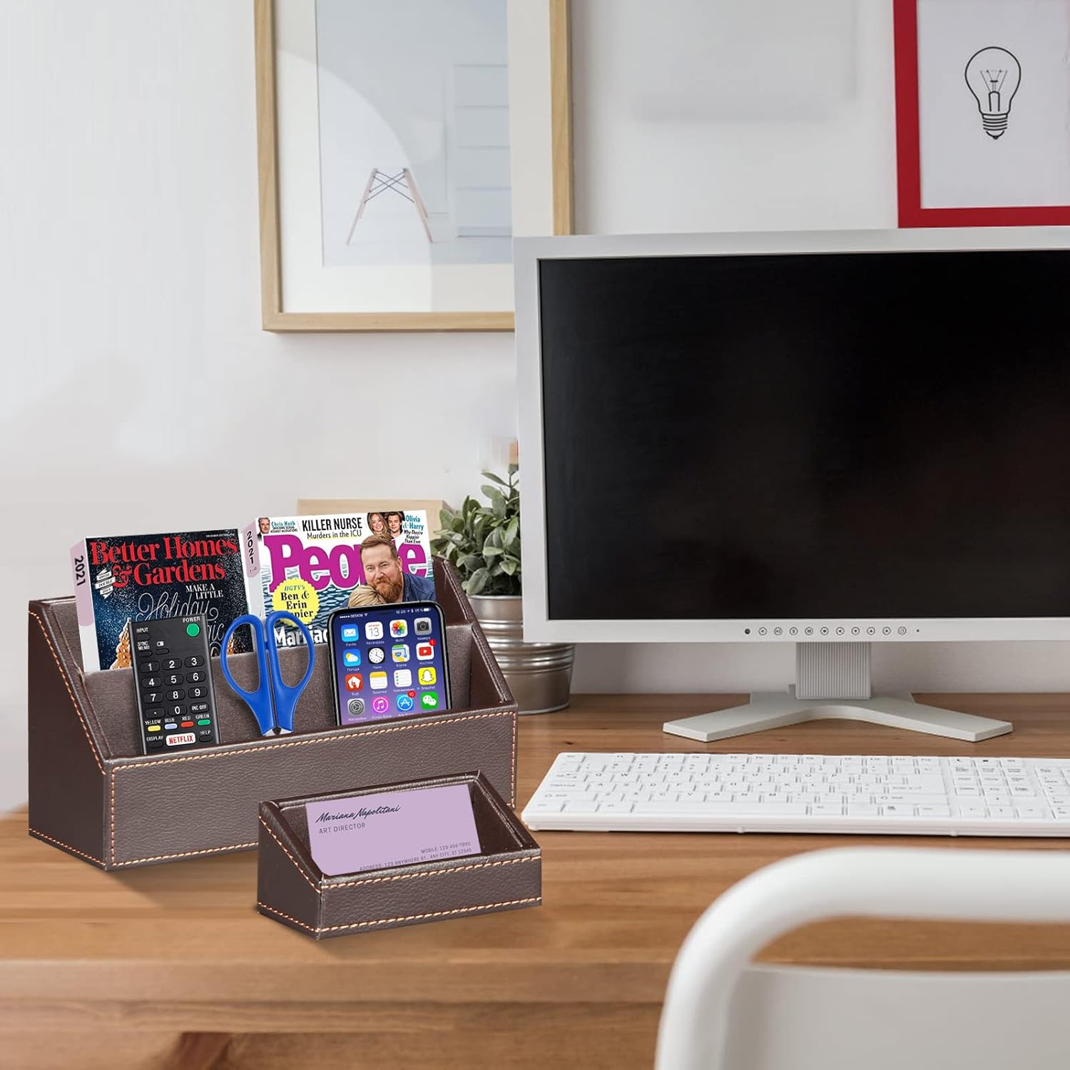 - / VERSATILE AND CUTE: Magazine holder can organize your files folder/ books/ letter size papers; Letter tray can storage A4 papers, notebooks, binders and documents. Mail sorter with 3 dividers for letters, stationary, invoices, etc; Pencil holder cup can storage pens/ markers/ scissors/ art supplies ; Sticky note holder stand can keeps notepads/ memos/ quick notes; Business card holder can keep name cards in place;