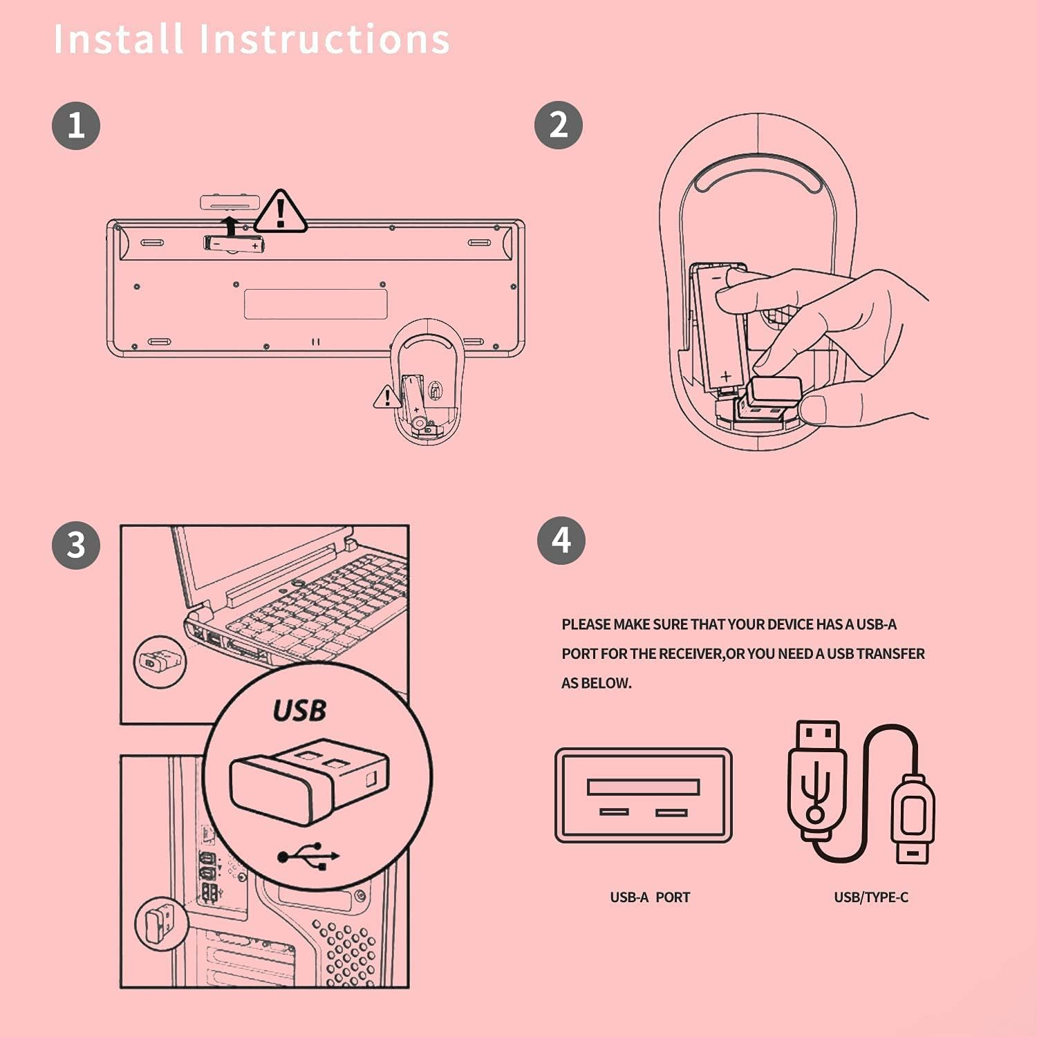 - 🎁 【INSTALLING THE BATTERIES】💞Wireless keyboard are use one AA alkaline batteries, Wireless mouse are use one AA alkaline batteries. (2pcs AA battery not included). Attention-The NANO receiver for the keyboard and mouse is on the back of the mice.