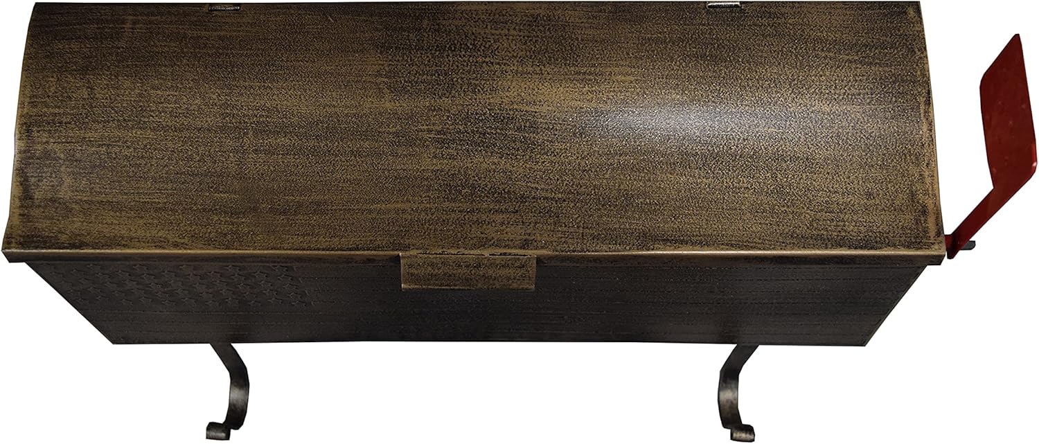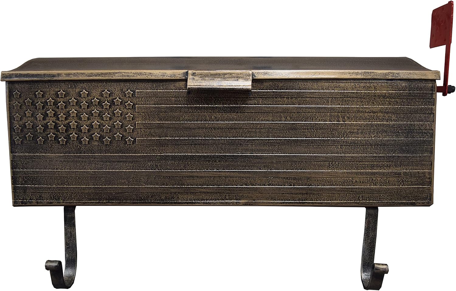 - Antique Bronze Patriotic Metal Wall Mounted Mailbox with Outgoing Mail Flag and Newspaper Hangers exterior dimensions are: 16.5in L x 4.5in W x 6in H, 4 Lbs