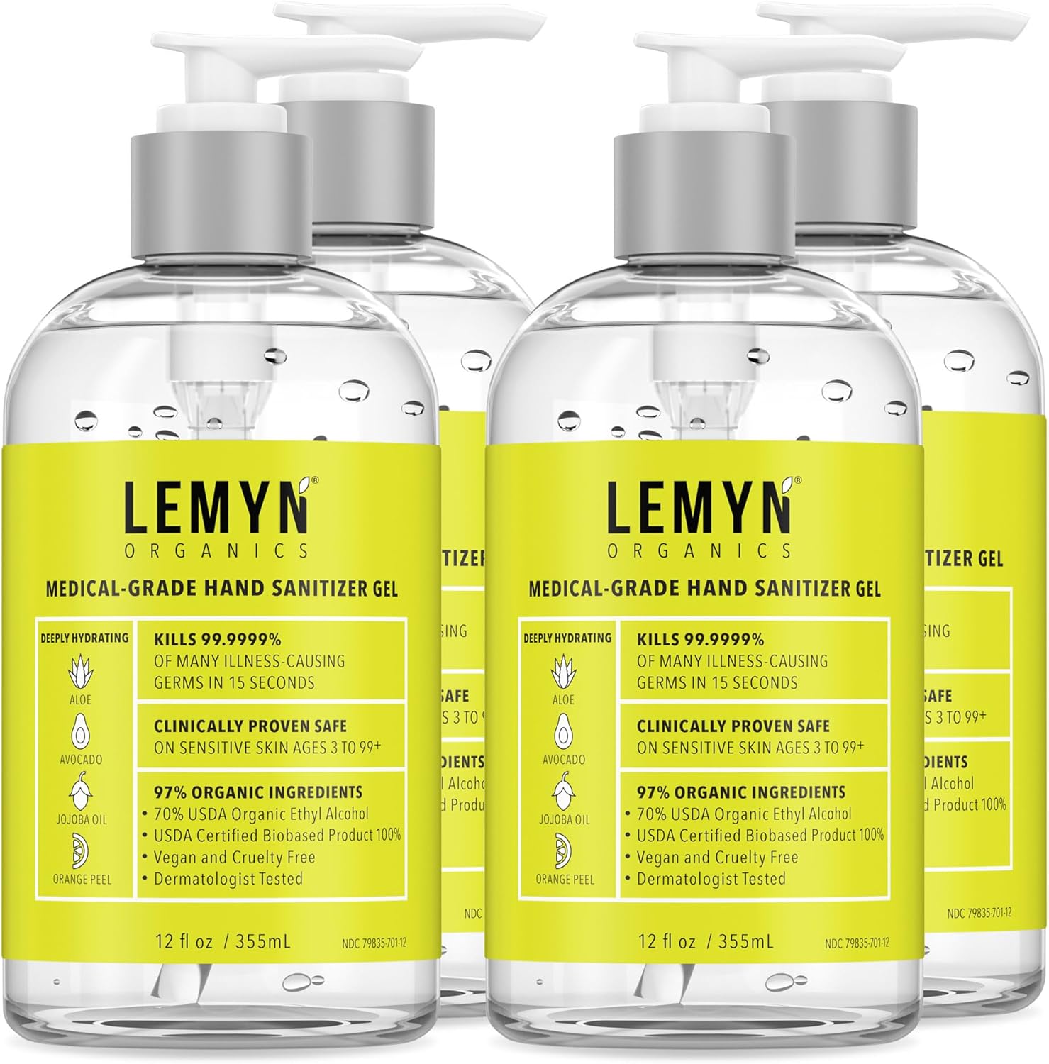 Medical Grade Hand Sanitizer Gel - 97% ORGANIC - 12 FL.OZ. (PACK OF 4)