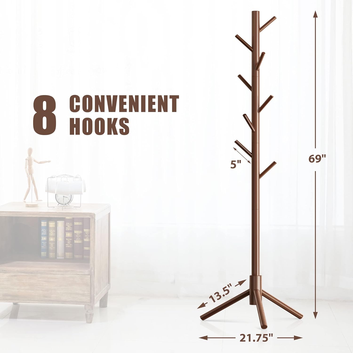 Haddockway Wooden Coat Rack Stand with 8 Hooks New Zealand Pine 3 Adjustable Coat Standing Tree Easy Assembly for Coats, Hats, Scarves and Handbags for Entryway, Hallway, Bedroom, Office