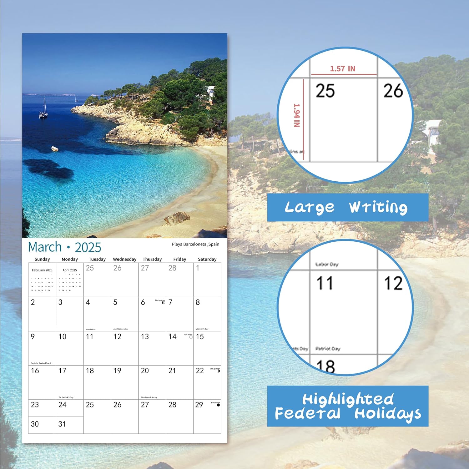 - PROFESSIONAL CONTENT DESIGN - You will love the feeling of bringing order and organization to your life.Oversized everyday blocks (1.5" x 1.9") give you extra space to jot down tasks and appointments. Includes all major US and Canadian holidays and moon phases. Exclude obscure holidays from other countries, which clutter your calendar and reduce your writing space.Size Closed: 12 x 12 inches.Size Open: 12 x 24 inches.