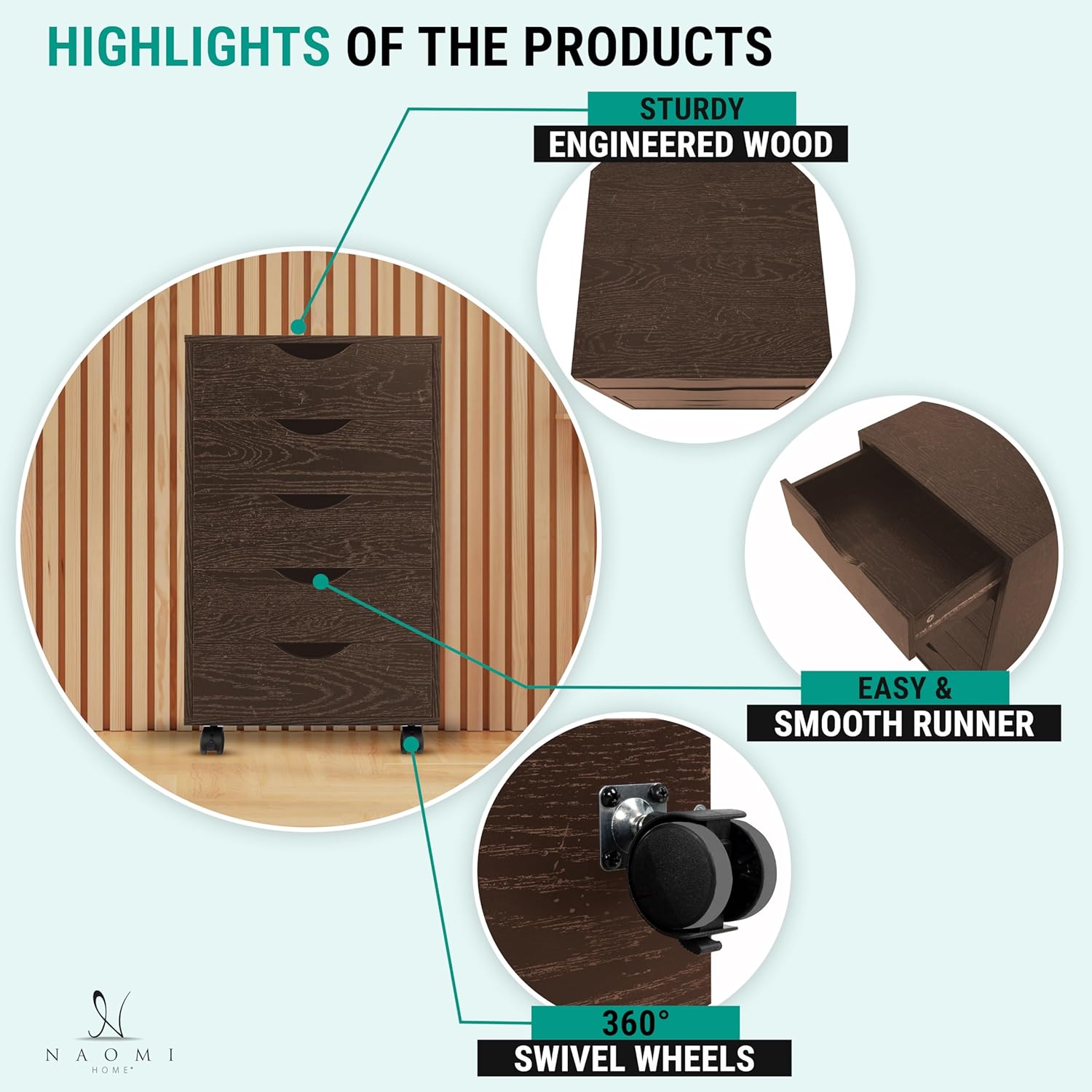 - EASY TO MOVE AROUND The Wooden File Cabinets for Home Office is equipped with 4 casters, with smooth operating mechanism making it a Mobile File Cabinet Under Desk. Casters can also be removed for stationary placement of the Office Storage Cabinet with Drawers.