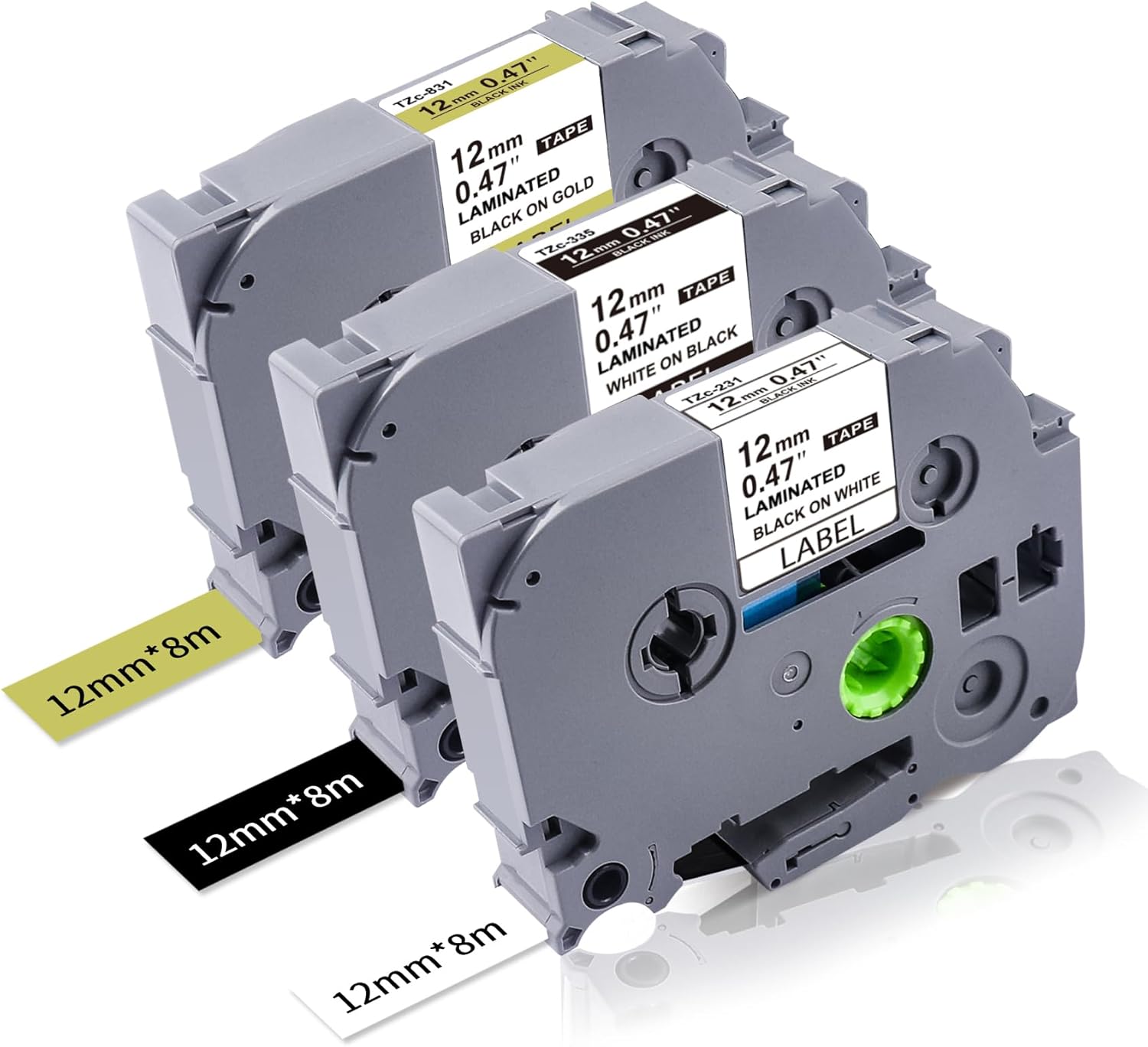 3-Pk 12mm TZ Labels Tape Compatible with Brother Ptouch TZe-231 335 831 Label Maker Tape 12mm 0.47" Laminated White/Black/Gold, Work for Brother Ptouch Label Maker PTD200 PTD400 PT1280 PT1880