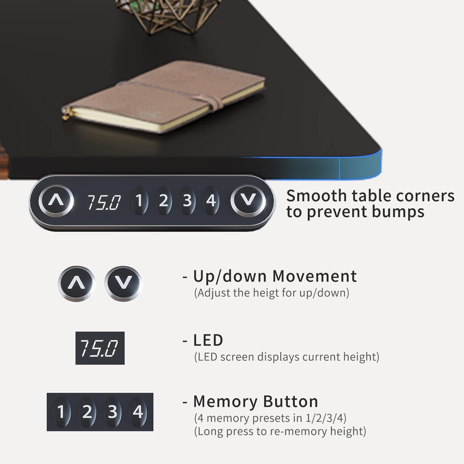 - Electric Height Adjustable: The height-adjustable standing desk can be adjusted in height from 27" to 45" according to your needs. 4 programmable memory presets can be easily and quickly raised and lowered, long press until you hear a beep to remember the commonly used height.