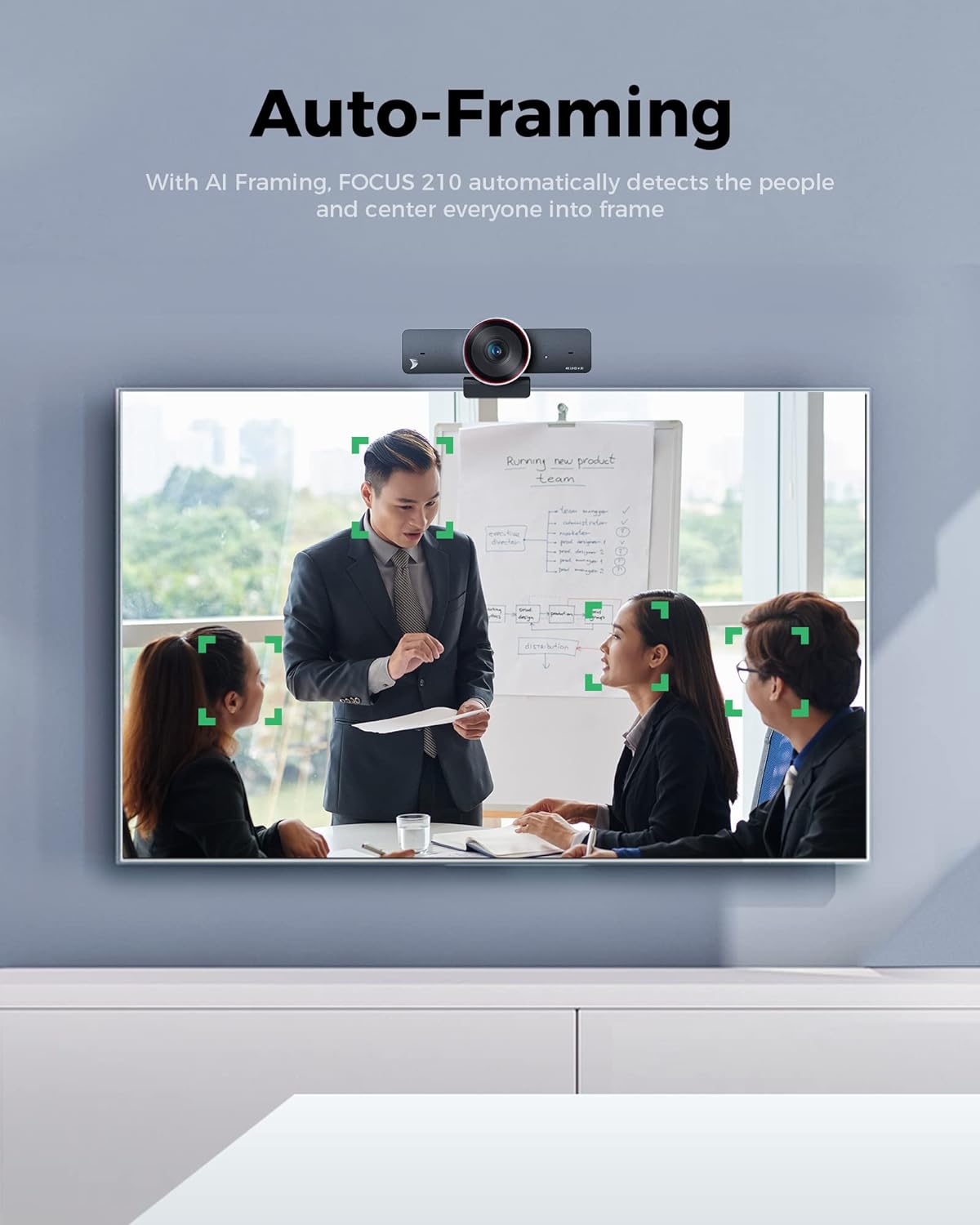 - AI Framing & Tracking: With auto framing, the webcam detects attendees within its FoV and centers everyone into the frame automatically. With presenter tracking, it intelligently detects and follows the presenter that is moving around. FOCUS 210 brings you an immersive conference experience!