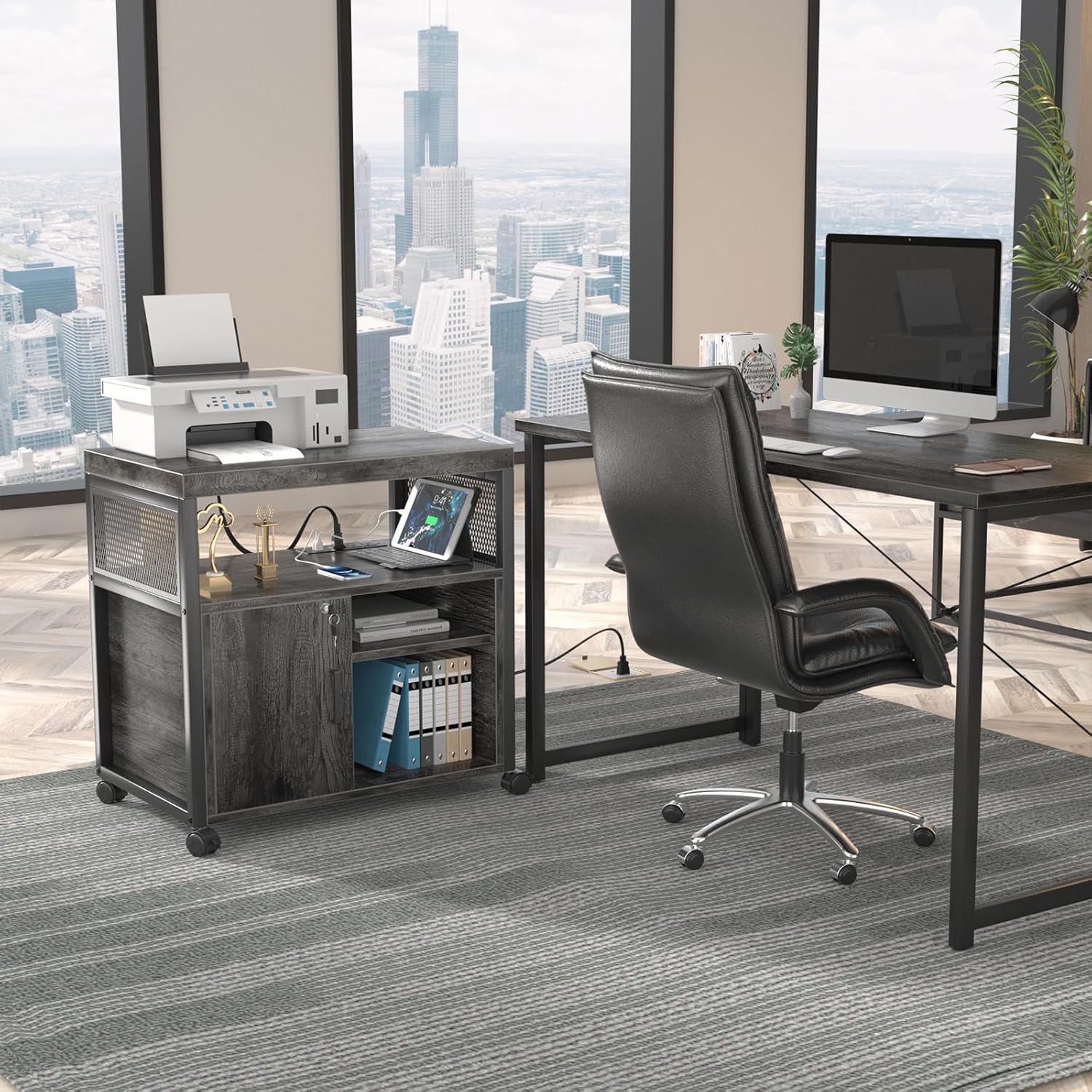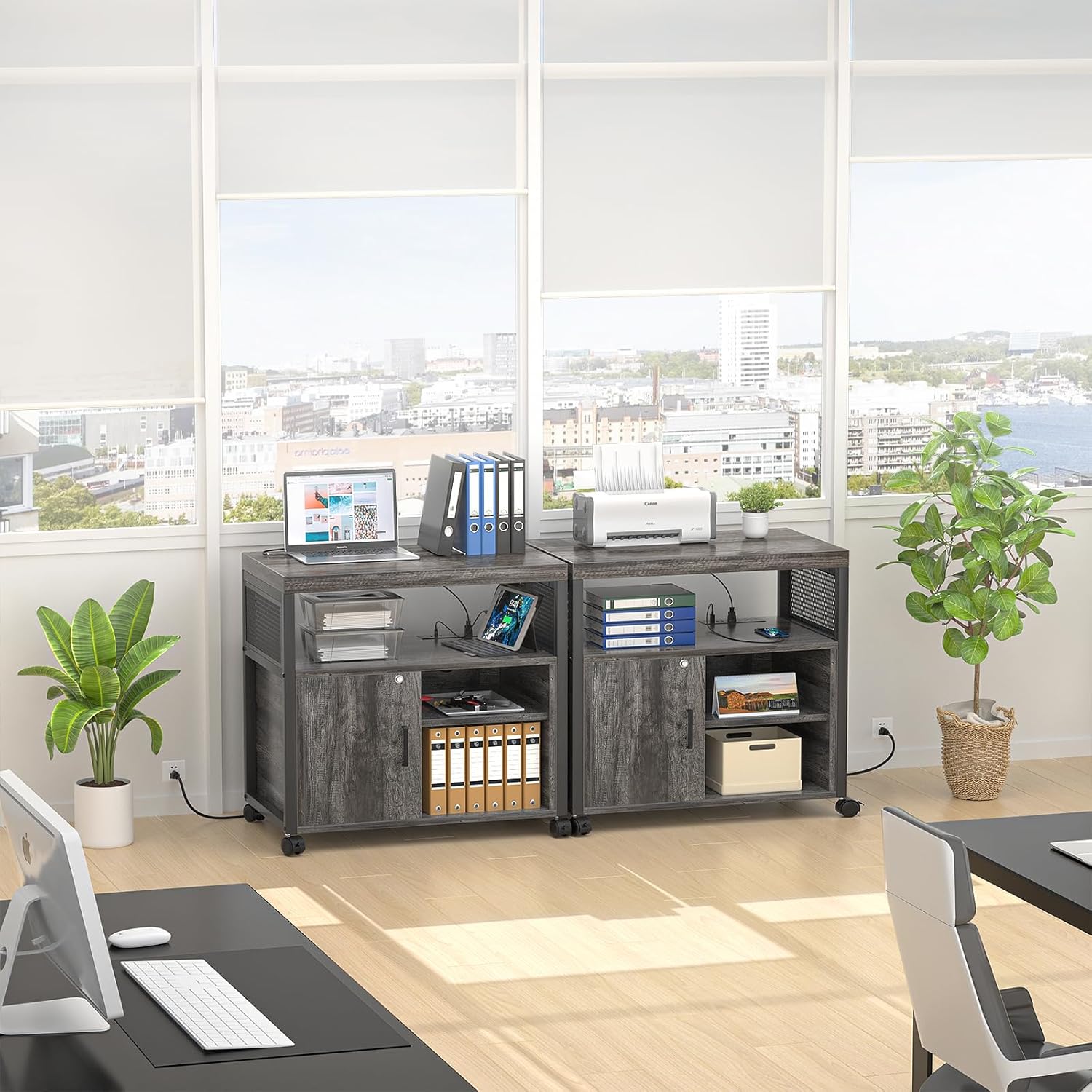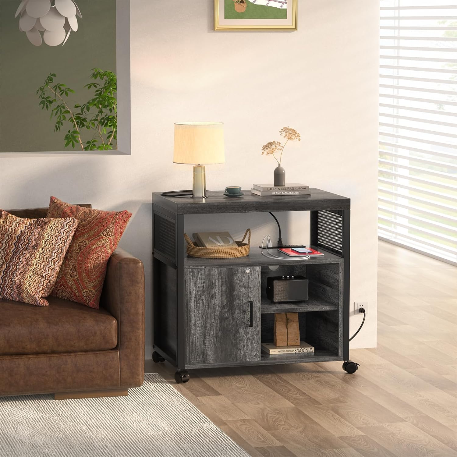 Unikito Rolling File Cabinet Lateral Office Filing Cabinets with Socket and USB Charging Port, Modern Printer Stand on Wheels Printer Cabinet with Door and Open Storage, Lockable, Black Oak