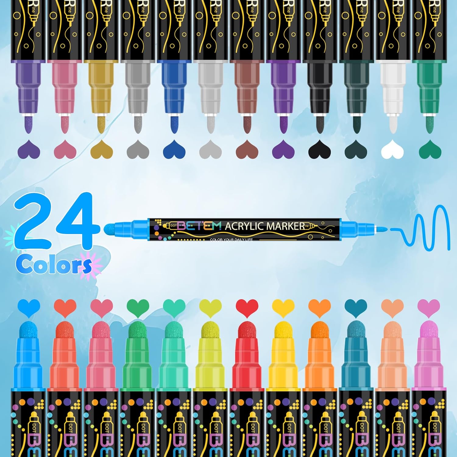 Betem 24 Colors Dual Tip Acrylic Paint Pens Markers, Premium Acrylic Paint Pens for Wood, Canvas, Stone, Rock Painting, Glass, Ceramic Surfaces, DIY Crafts Making Art Supplies