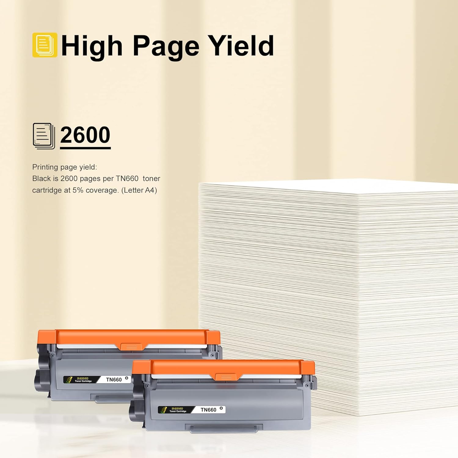 - Printing page yield: 2,600 Pages per TN660 black toner cartridge at 5% coverage
