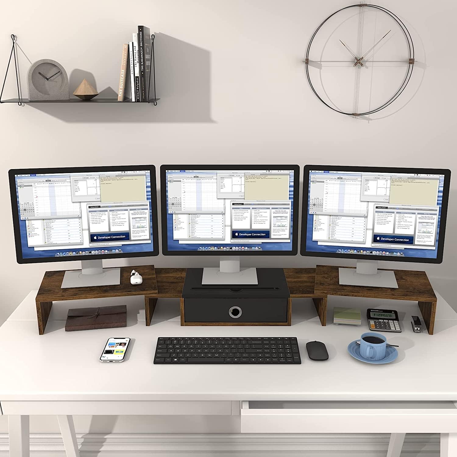 WESTREE Triple Dual Monitor Stand Riser with Drawer,Extra Large Adjustable for 2~3 Monitors,Solt for Phone & Tablet, Desktop Organizer Stand for Computer,Laptop,Printer,TV