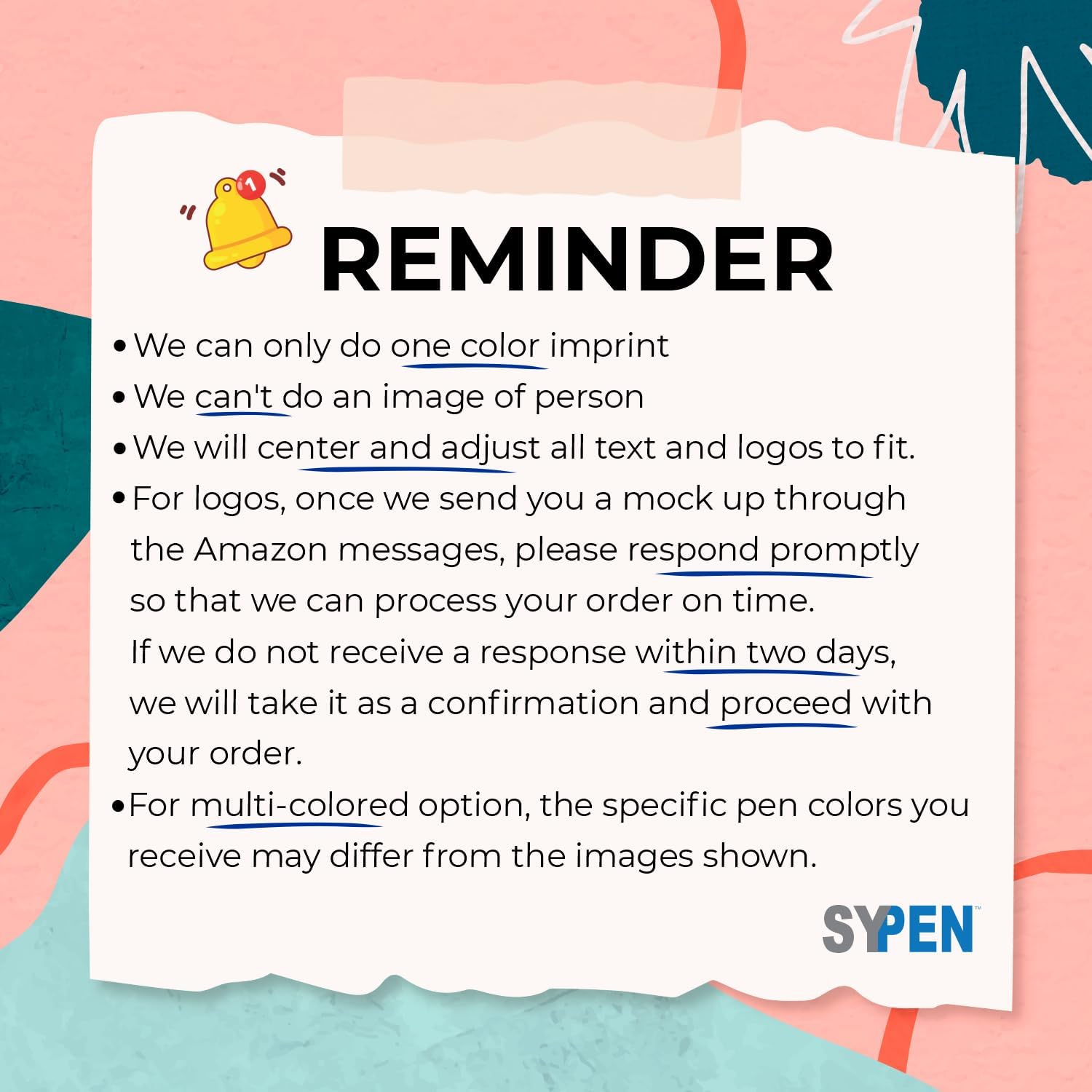 - Colors: the ballpoint ink color for these pens is black. The Imprint color for the text or/and logo will either be matching to trim color or black, choose your option at the "customize now" button. Note, we can only do one color imprint. We cannot do an image of a person. Note: For multi-colored option, the specific pen colors you receive may differ from the images shown. But rest assured, you'll get a fantastic mix of colors to brighten up your writing!
