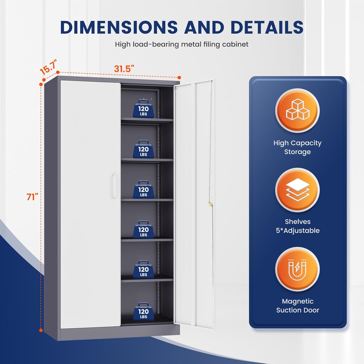 Yizosh Metal Garage Storage Cabinet with 2 Doors and 5 Adjustable Shelves - 71" Steel Lockable File Cabinet,Locking Tool Cabinets for Office,Home,Garage,Gym,School (Gray White)