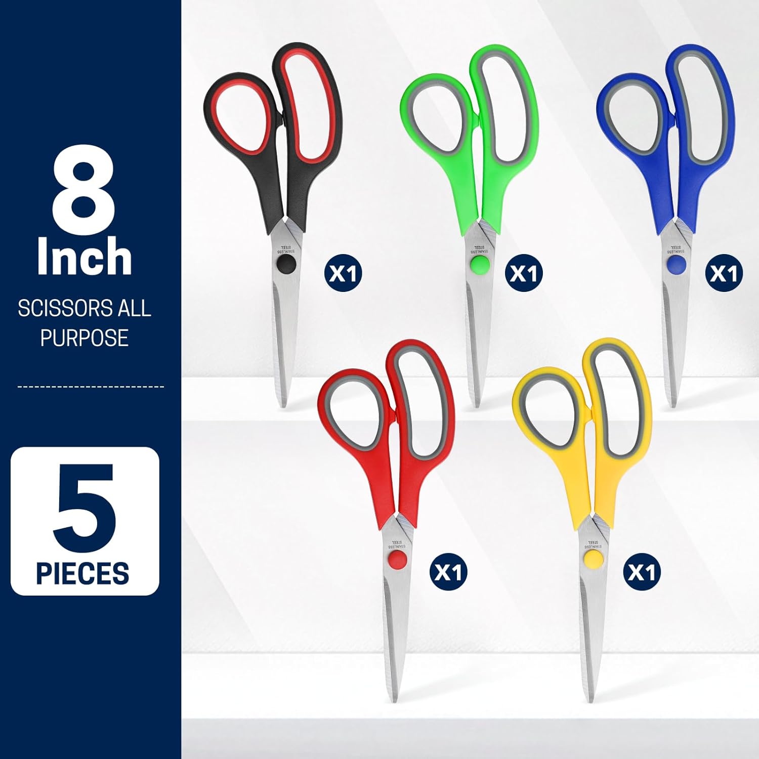 5-Pack, 8" Scissors All Purpose Comfort-Grip Handles Sharp Scissors for Office Home School Craft Sewing Fabric Supplies, High/Middle School Student Teacher Scissor, Right/Left Handed