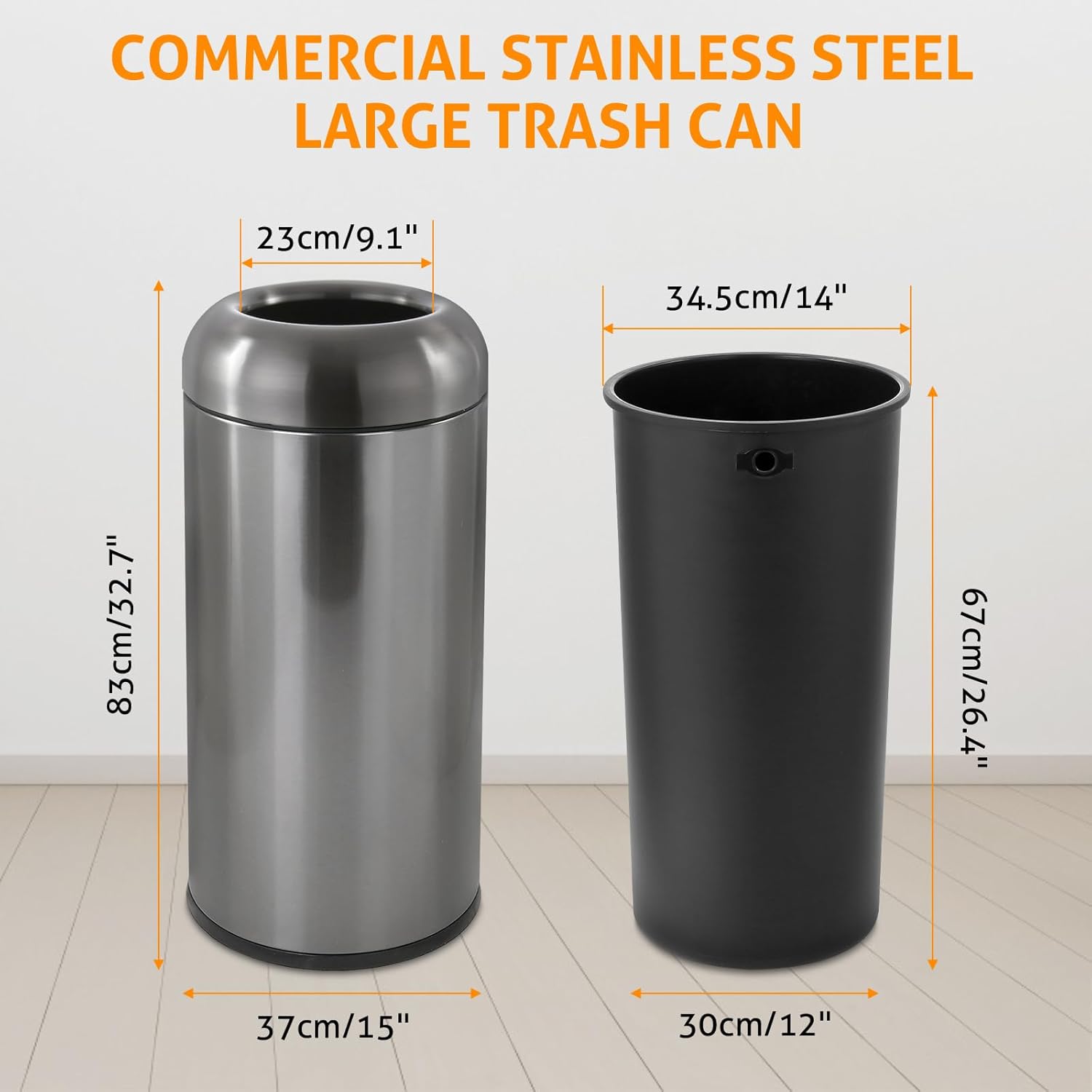 - Spacious 16-Gallon Capacity β This extra-large stainless steel trash bin (32.67" tall, 14.56" diameter) offers ample space for high-traffic areas like hotel lobbies, banquet halls, supermarkets, restaurants, and homes, reducing frequent bag changes