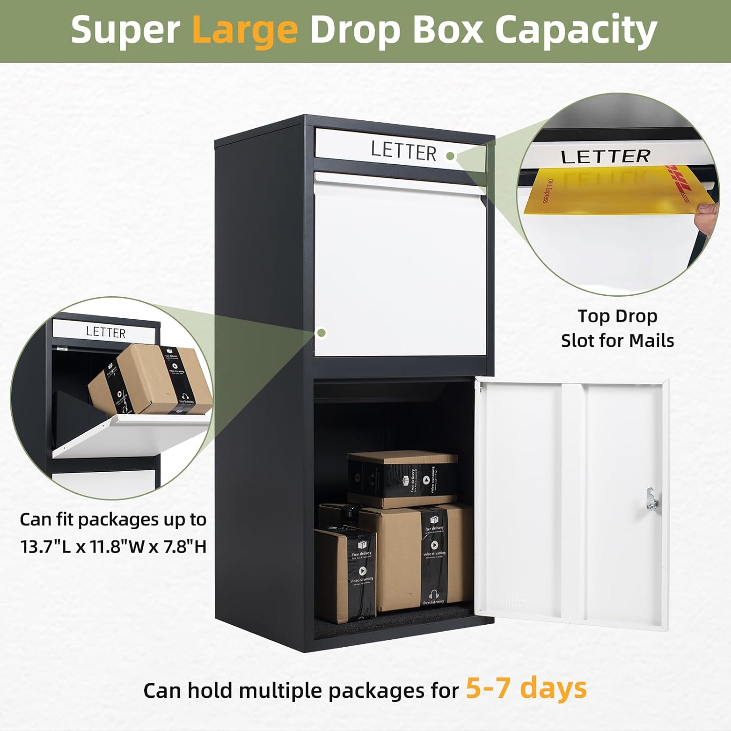 Package Delivery Boxes for Outside, Extra Large Capacity Modern Mailbox, Outdoor Freestanding Porch Box for Package (Black and White)