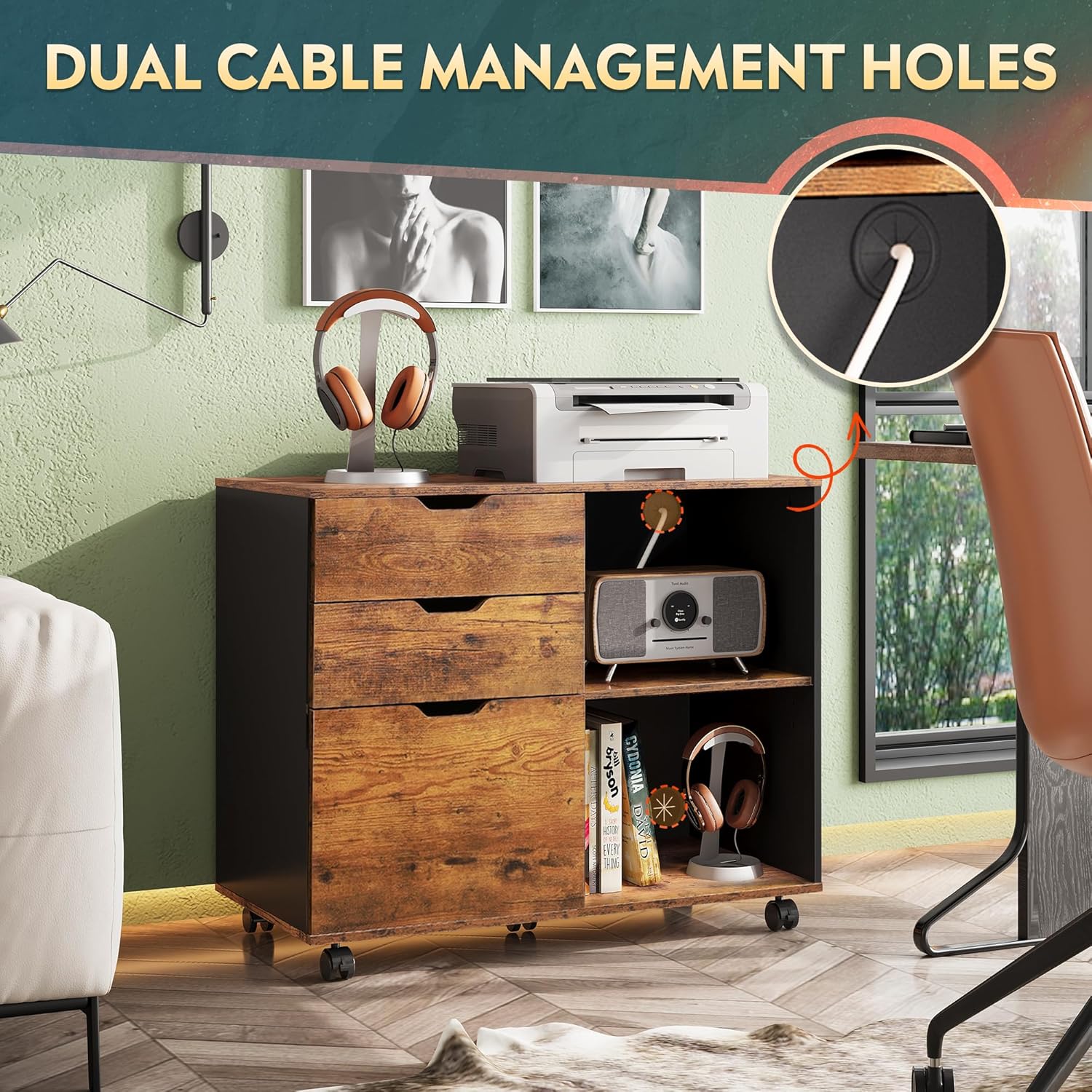 DEVAISE 3-Drawer Wood File Cabinet, Mobile Lateral Filing Cabinet, Printer Stand with Open Storage Shelves for Home Office, Rustic Brown