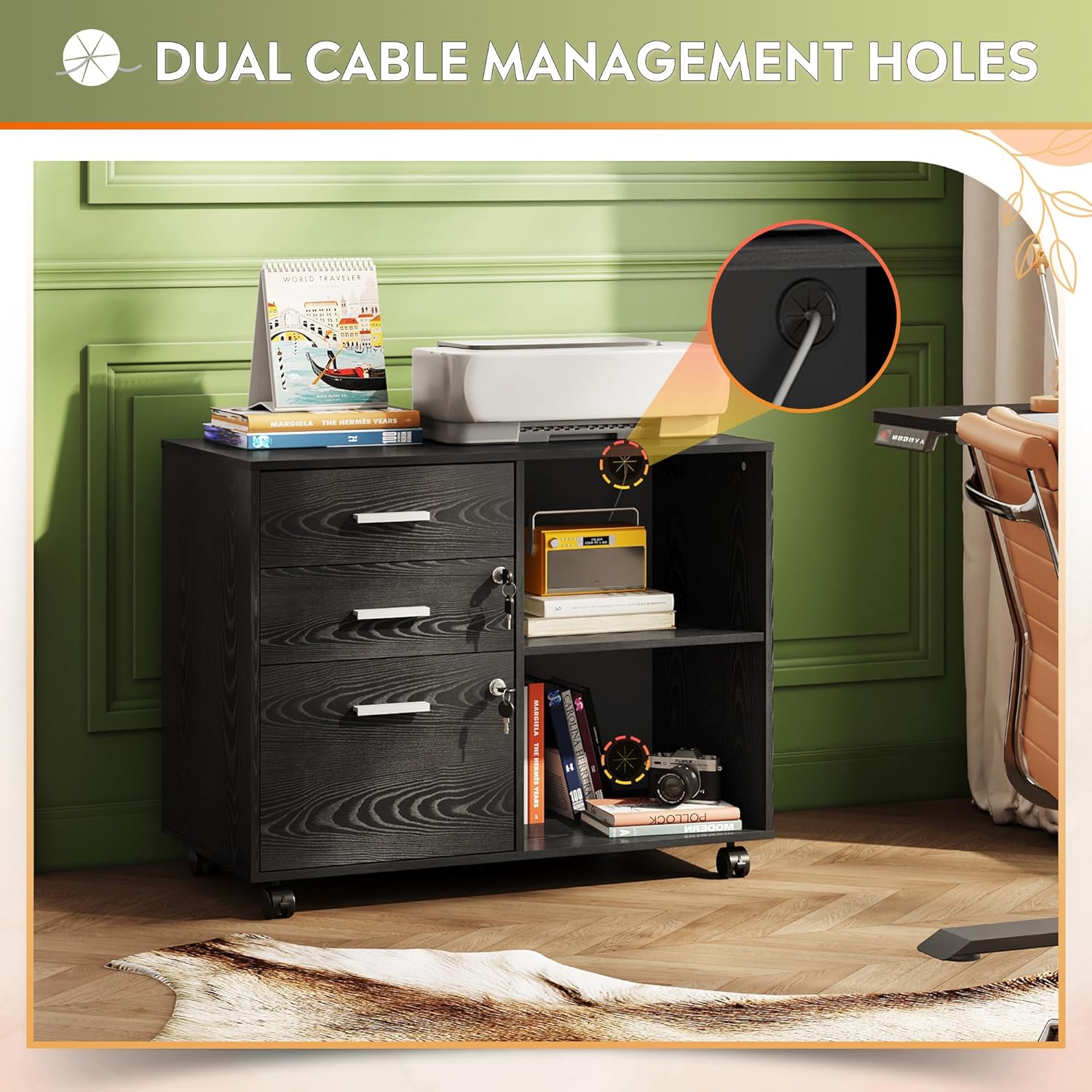 DEVAISE 3-Drawer Wood File Cabinet with Lock, Mobile Lateral Filing Cabinet, Printer Stand with Open Storage Shelves for Home Office, Black