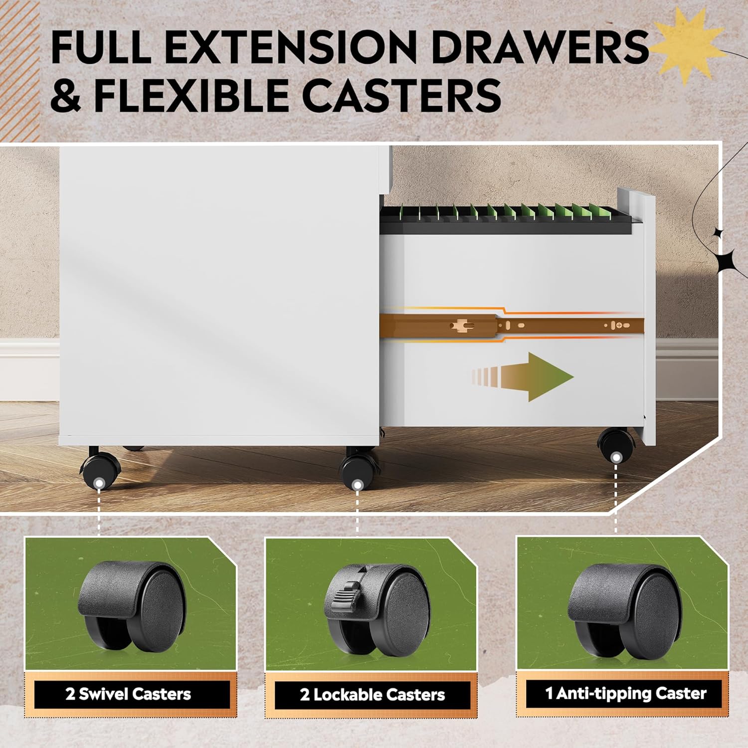 - DURABLE CASTERS: 5 rolling casters which can move smoothly on both wooden floor and carpet. With front 2 lockable braking wheels, makes office supply rested on top, like printer. Middle casters prevent tipping over when all drawers open at the same time.