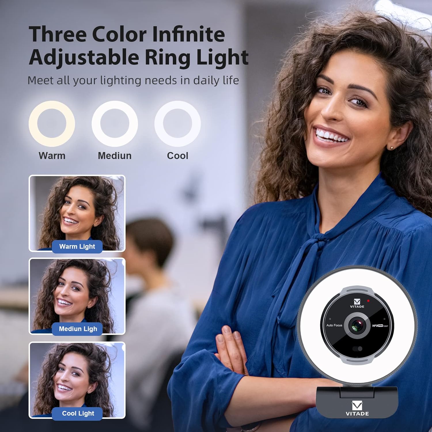 - 【Webcam with Mutil-Funtion Ring Light for Better Portrait】 The streamcam built in 3 different colors LED and stepless adjustable brightness to delivery brighter and softer tone light without glare. Single press the touch button to change the color temperatures.A rotating bezel allows for quick, brightness level changes and turn on/off the light without the need to go into software settings.
