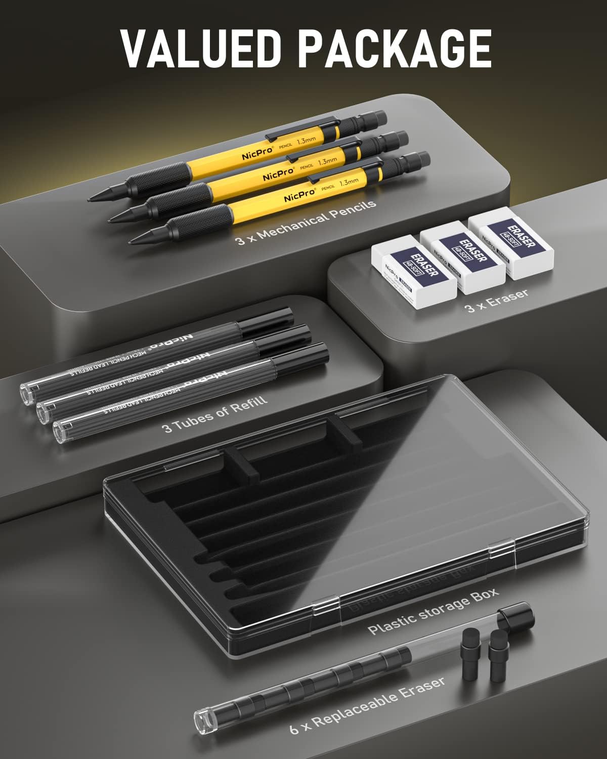 - 1.Mechanical Pencil Set: Come with 3pcs 1.3mm mechanical pencil, 3pcs 4B eraser, 12pcs eraser refill, 6 tube of lead refills (12pcs/tube),each lead is 120mm long, the full length of the pencil’s barrel.There is also a plastic pencil case included,a realistic set for field work.