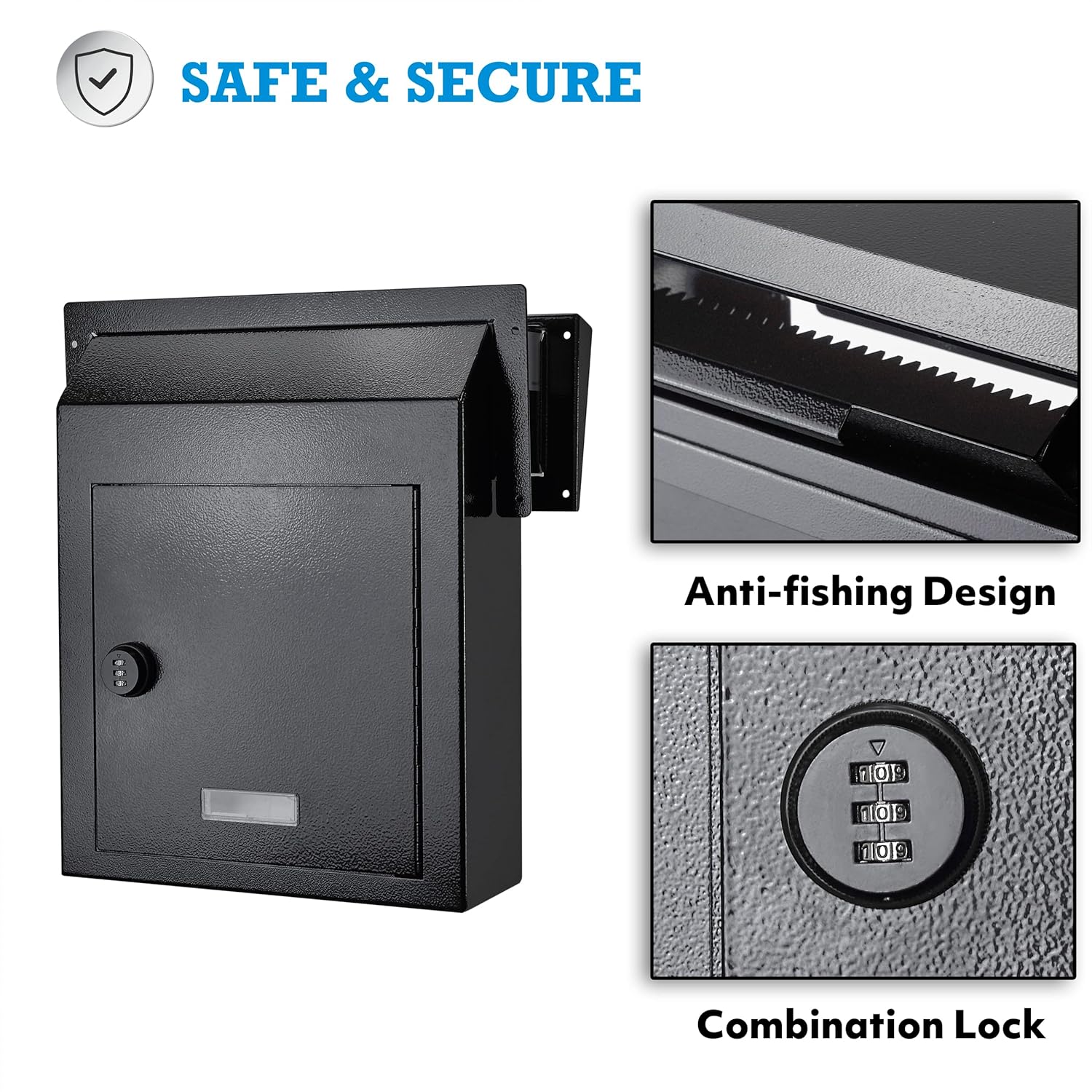 - COMBINATION LOCK MAILBOX: This 12" x 4.25" x 15'' security mailbox comes with a built-in combination lock. Our drop boxes with lock for business can only be accessed with the correct passcode you set.