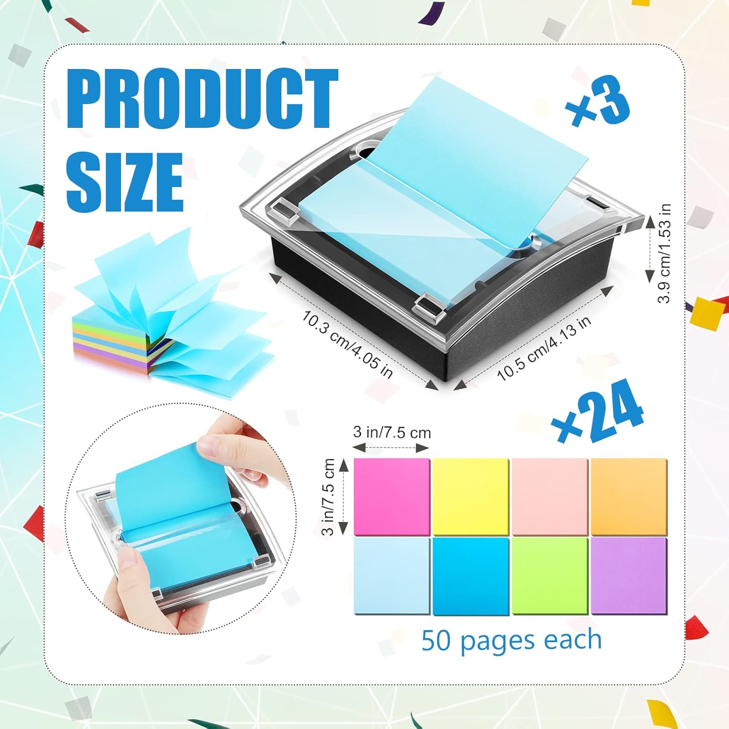 - Set Includes: you will get 3 pieces of sticky note holders and 24 pads of pop up colorful sticky notes, 50 Sheets per pad, sticky note box size 10.5 x 10.5 x 4 cm/ 4.1 x 4.1 x 1.6 inches, the bottom is black, the top is transparent, sticky note size 7.5 x 7.5 cm/ 3 x 3 inches, meet your needs for quantity