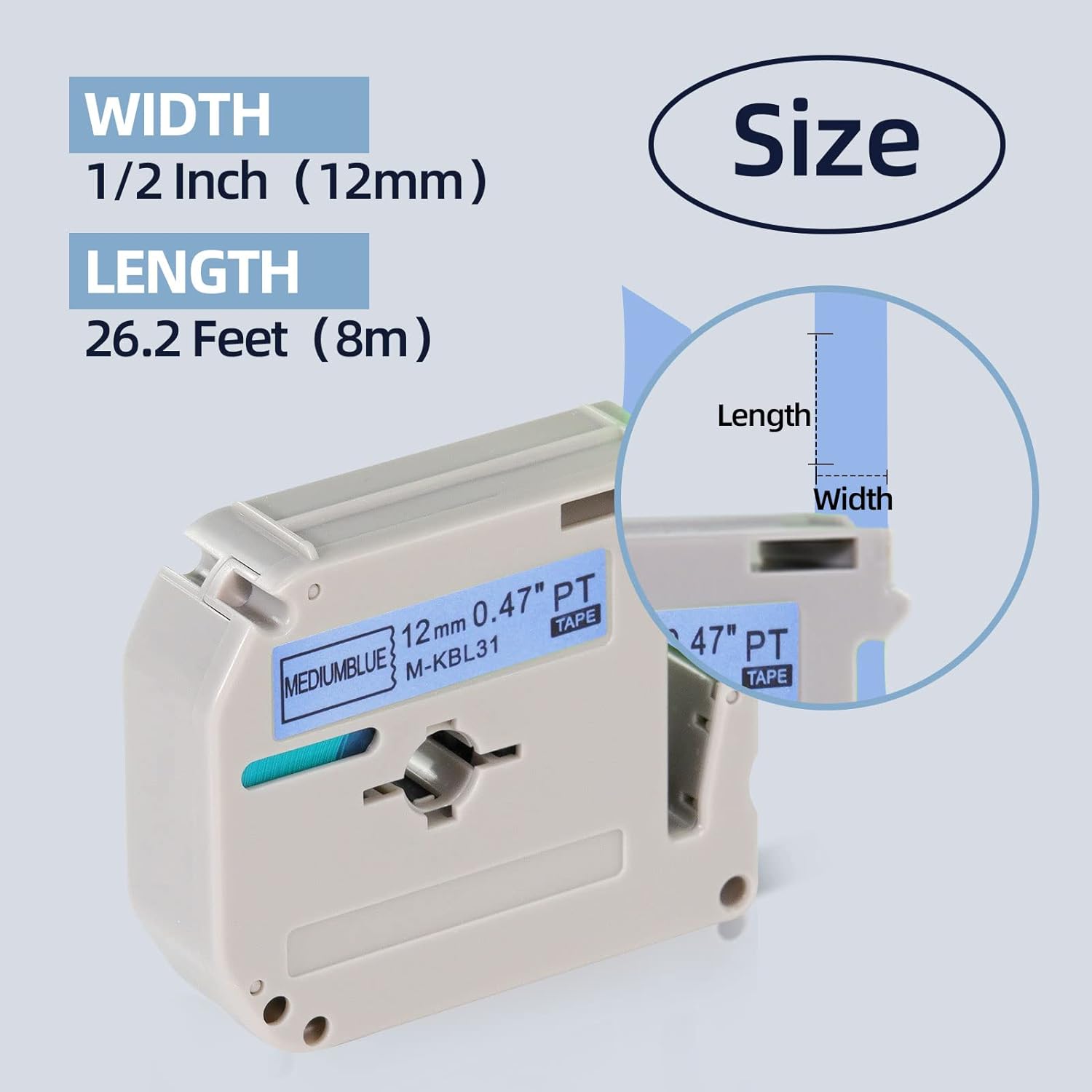 - 【Package In Cludes】 - Set of 6 colors label tape compatible with brother m label tape. Replacement for brother p touch M tape 12mm 0.47 M-K231 black on white, (M-KC31)black on Fluorescent Yellow, (M-KD31)black on Fluorescent Green, (M-KB31)black on Fluorescent Orange, (M-KP31)black on Fuchsia, (M-KBL31)black on Lake blue; Size : 1/2 inch x 26.2 feet ( 12 mm x 8 m) ;