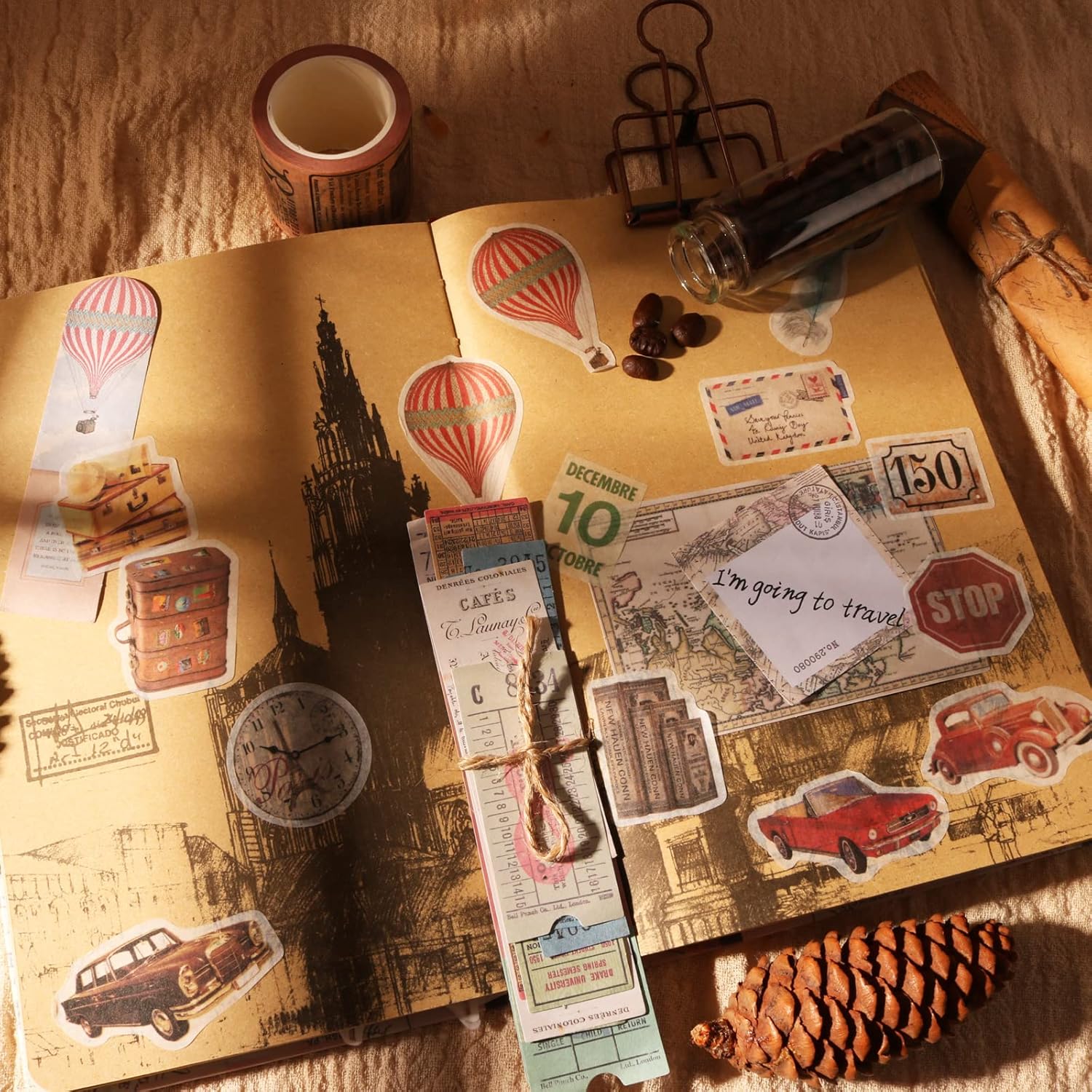 - ăWorld Travel Themeă 200 Pieces world travel theme assorted paper & stickers, including old cars and electronic devices, old world maps, receipts, tickets, buildings from the past etc. Perfect for junk journals, scrapbooking, collages, or travel-themed art projects!