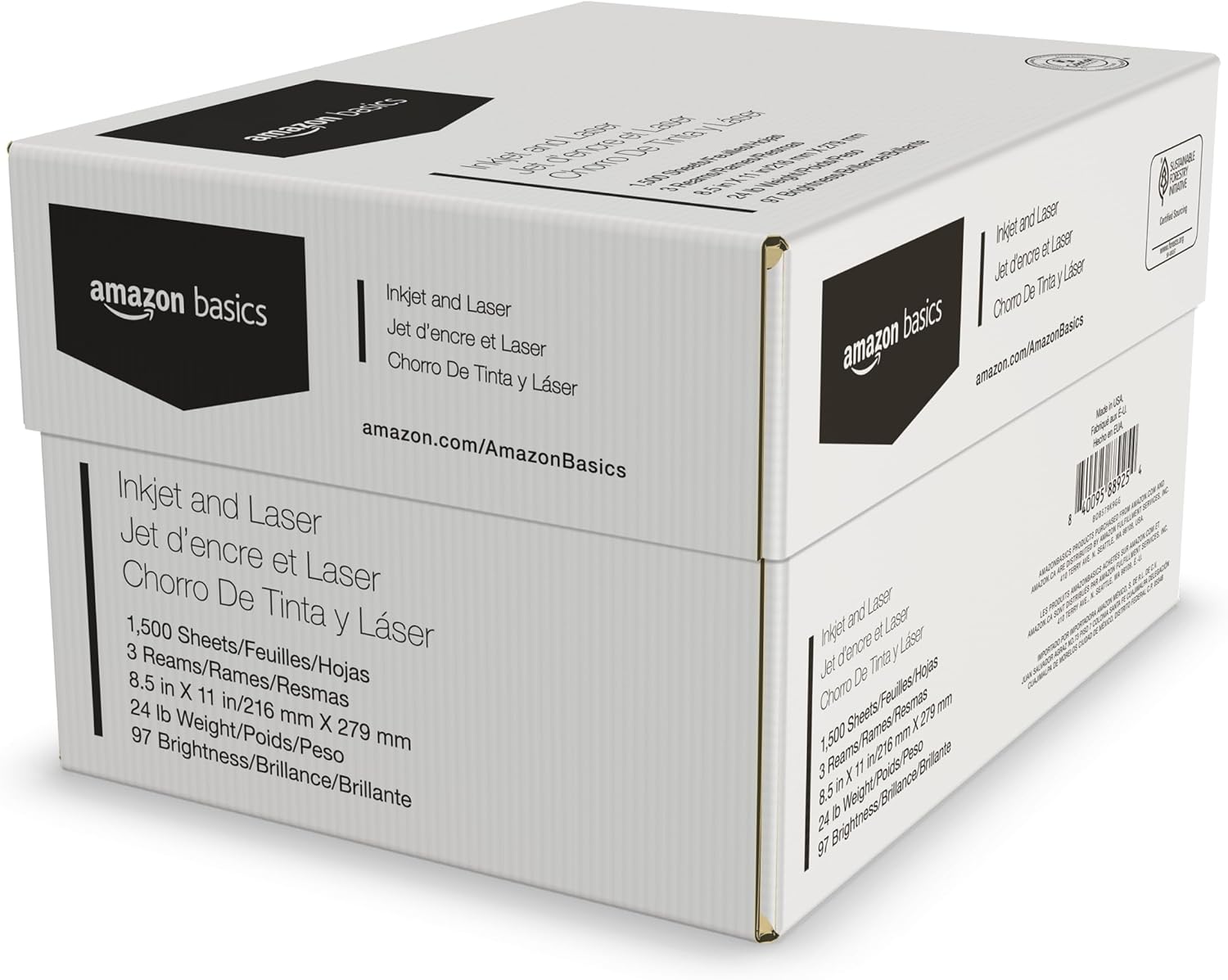 Amazon Basics Multipurpose Copy Printer Paper, 8.5-x-11-inch, 24lb, 1500 Sheets (3 Packs of 500), 97 Bright, White