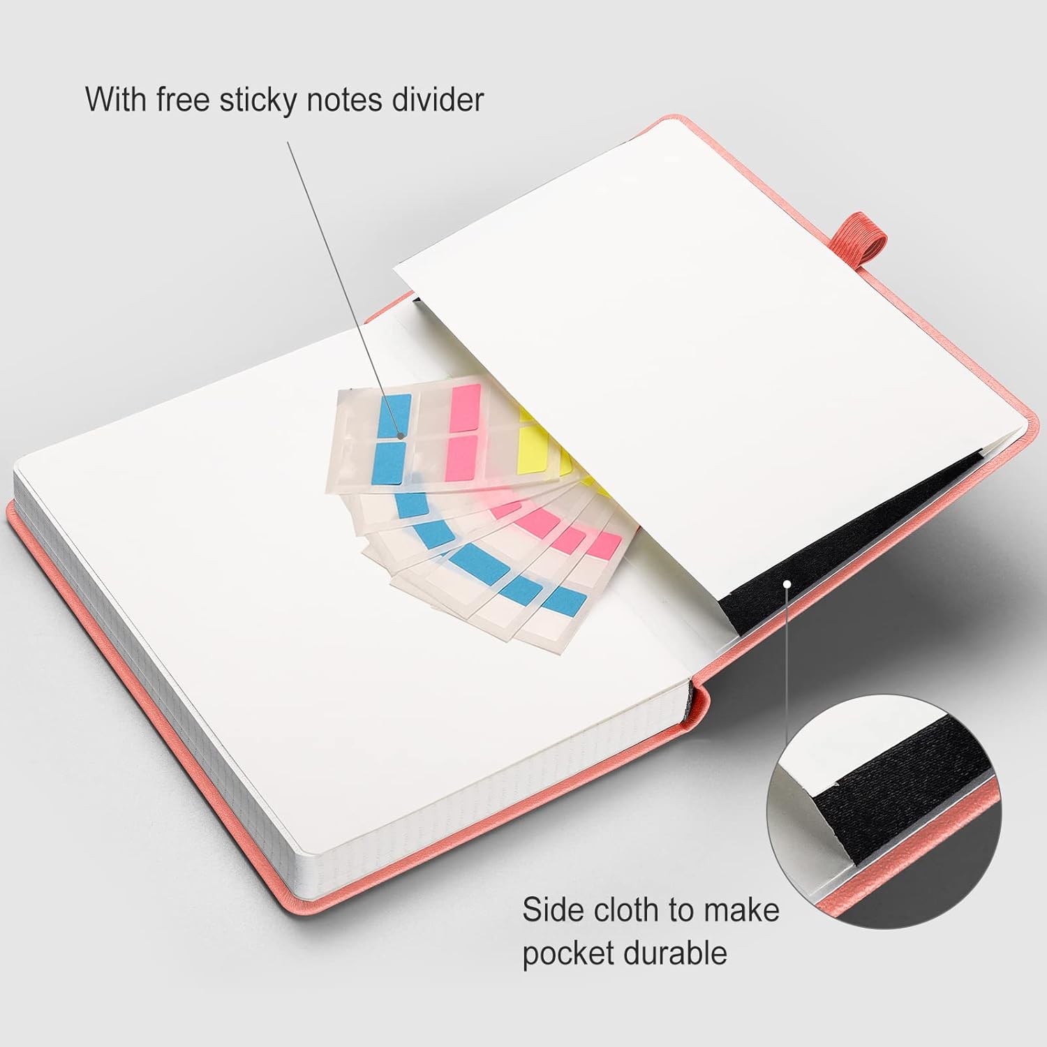 - Humanized Design: Divider sticky notes and 2 bookmarks help you find important content faster. Journal stencil included, an ideal tool for bullet journaling. Back inner pocket holds notes, business cards, small gadgets, etc. Closes with an elastic band and has a pen holder loop for any pen