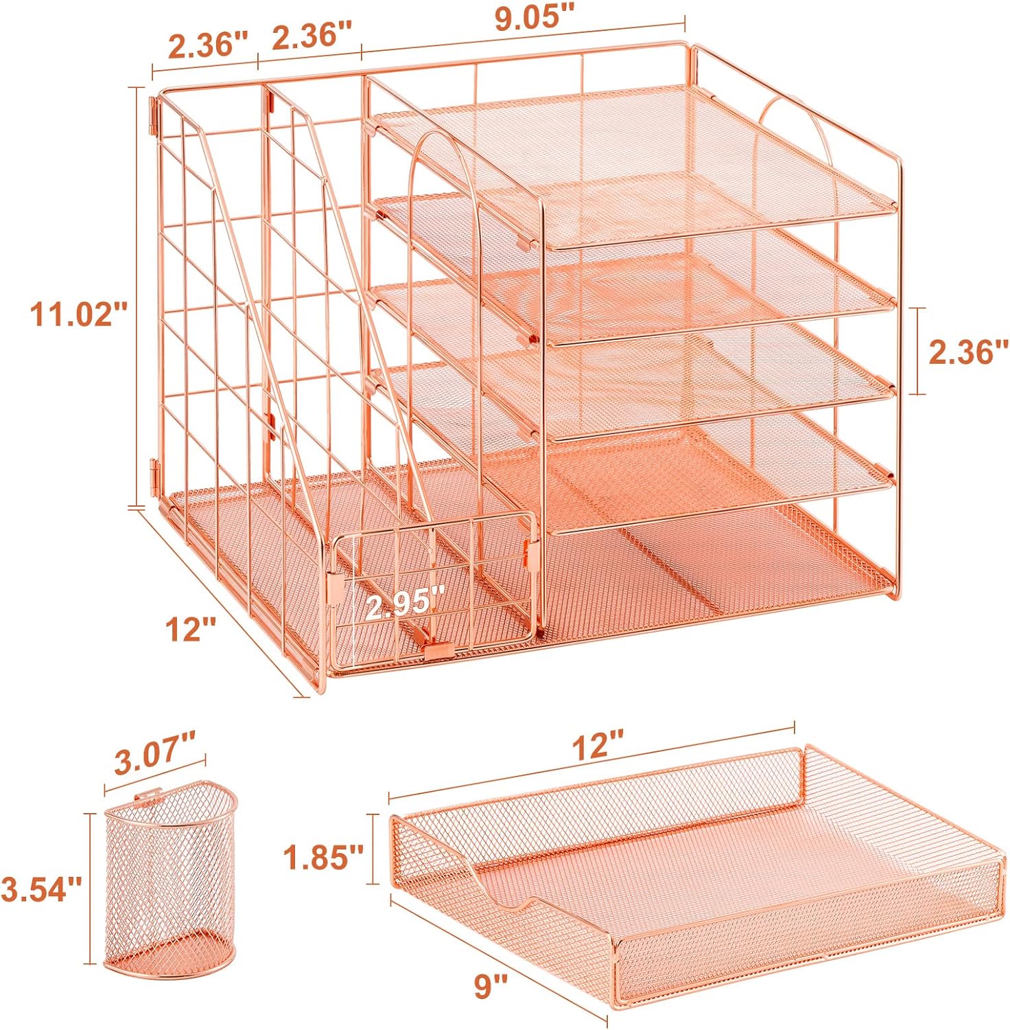 Marbrasse Rose Gold Desk Organizer with File Holder, 5-Tier Paper Letter Tray Organizer and Drawer, Mesh Desktop Storage with Magazine Holder for Office Supplies