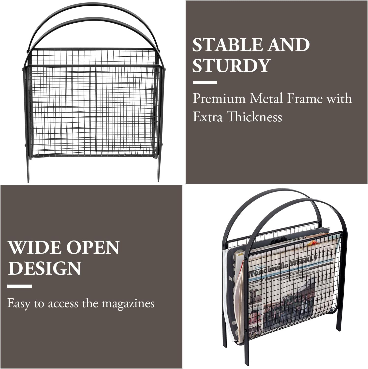 - Elegant mid-century inspired handbag design magazine holder rack with vintage matte black tone metal wire mesh finish for your home or office