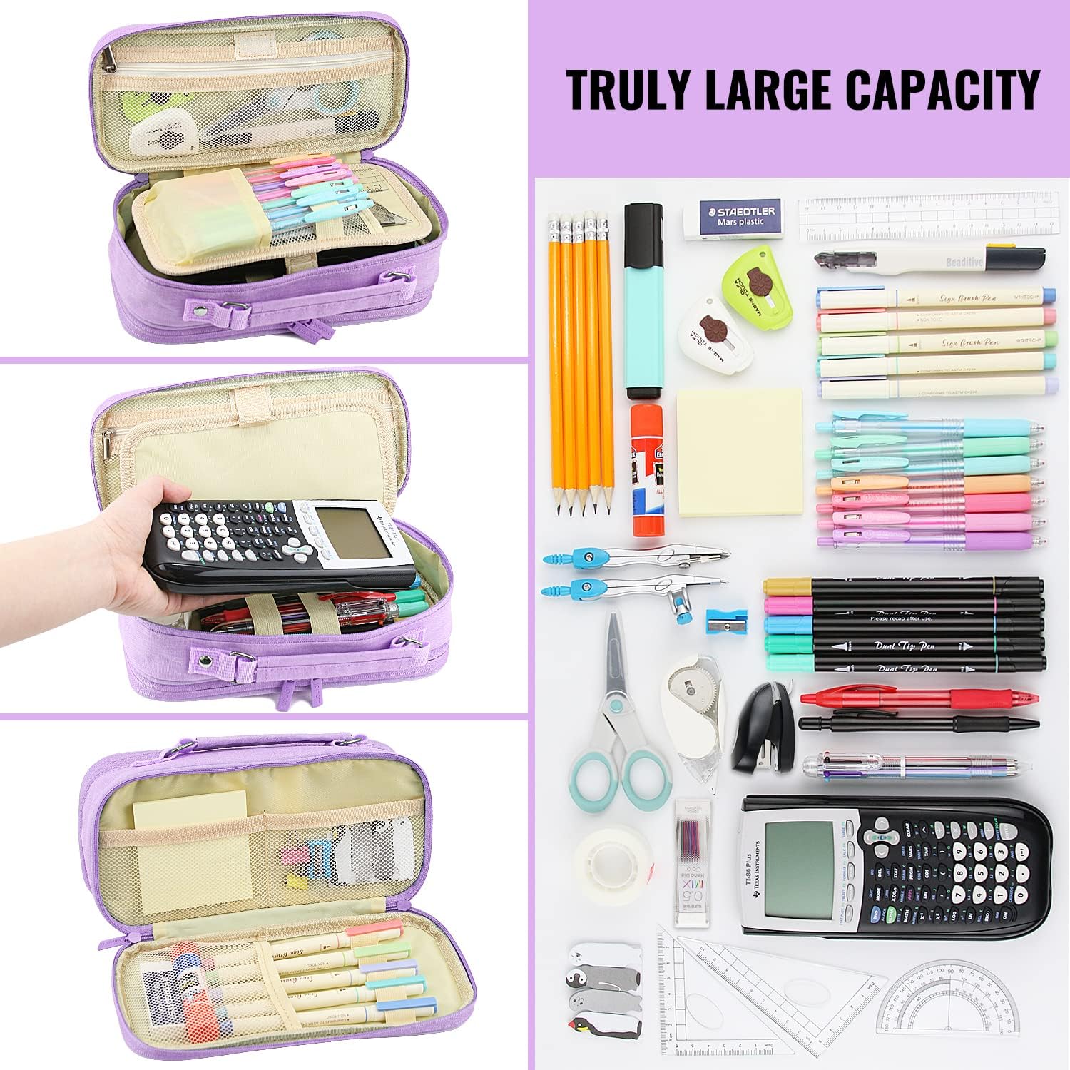 - Unique Designs - Fashionable colors and appearance, with three-dimensional and layered structure design. Two double-zipper, interior mesh pockets, and different compartments are designed for this pencil bag, it can hold pretty much everything a student needs. With rivet reinforcement handle strap design, not easy to break; and thickened handle strap for comfortable use and easy to carry.