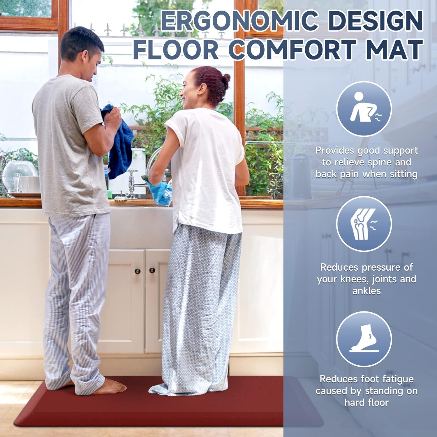 - 【Anti-Fatigue】Comfort floor mat provides comfort when standing. Reduces pressure on knees and ankles. Relieves back and spine pain when standing and relieves fatigue caused by standing for long periods.