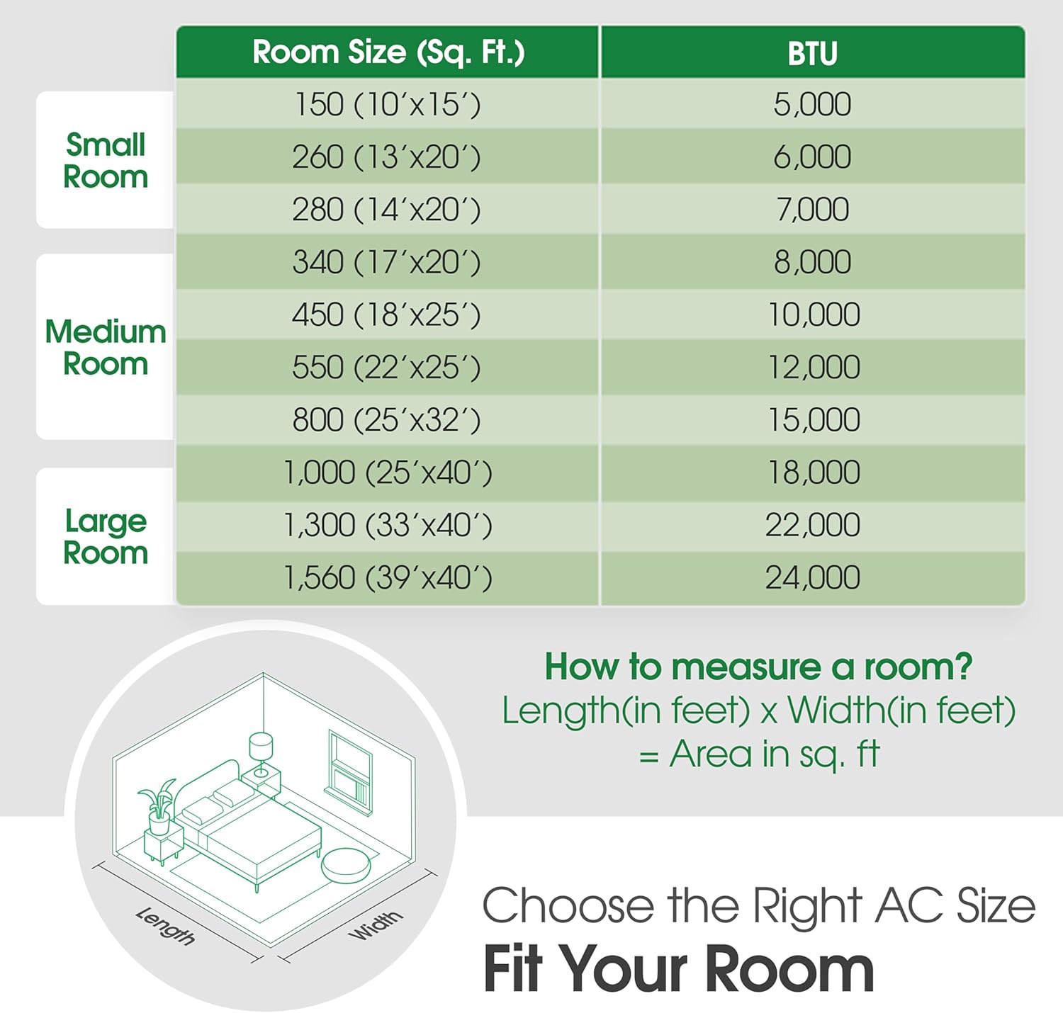 - Cools Rooms up to 1560 Square Feet: This window unit is ideal for cooling large rooms (39' X 40'); With 1560 square feet cooling coverage, keep your bedroom, office, or multiple small rooms on the same floor comfortably cool with this window air conditioner