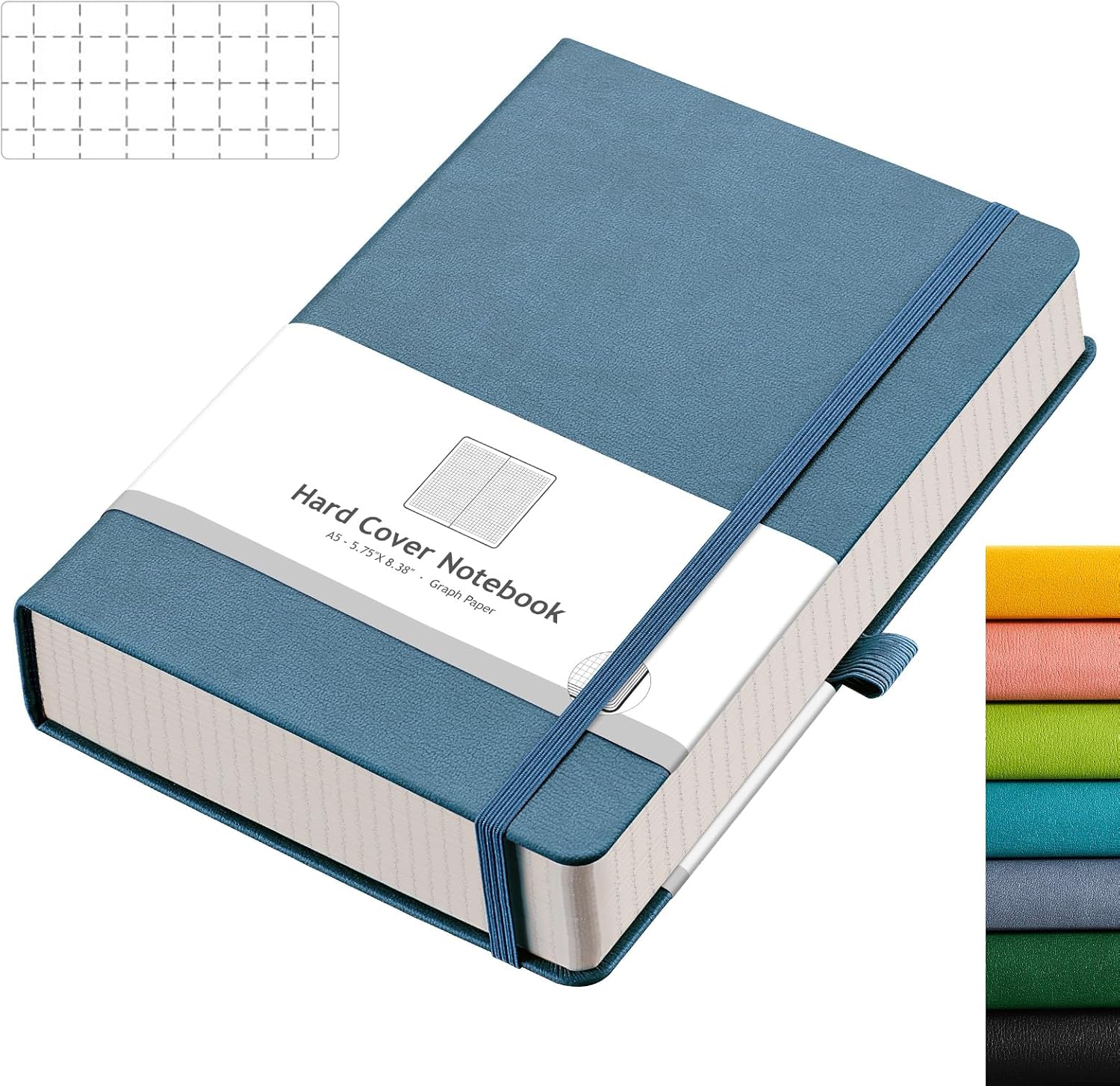 AHGXG Graph Paper Notebook - 320 Pages Grid Notebook Thick Journal A5, 100gsm Thick Graph Paper, Leather Hardcover, Inner Pocket,5.75'' × 8.38''- GrayBlue