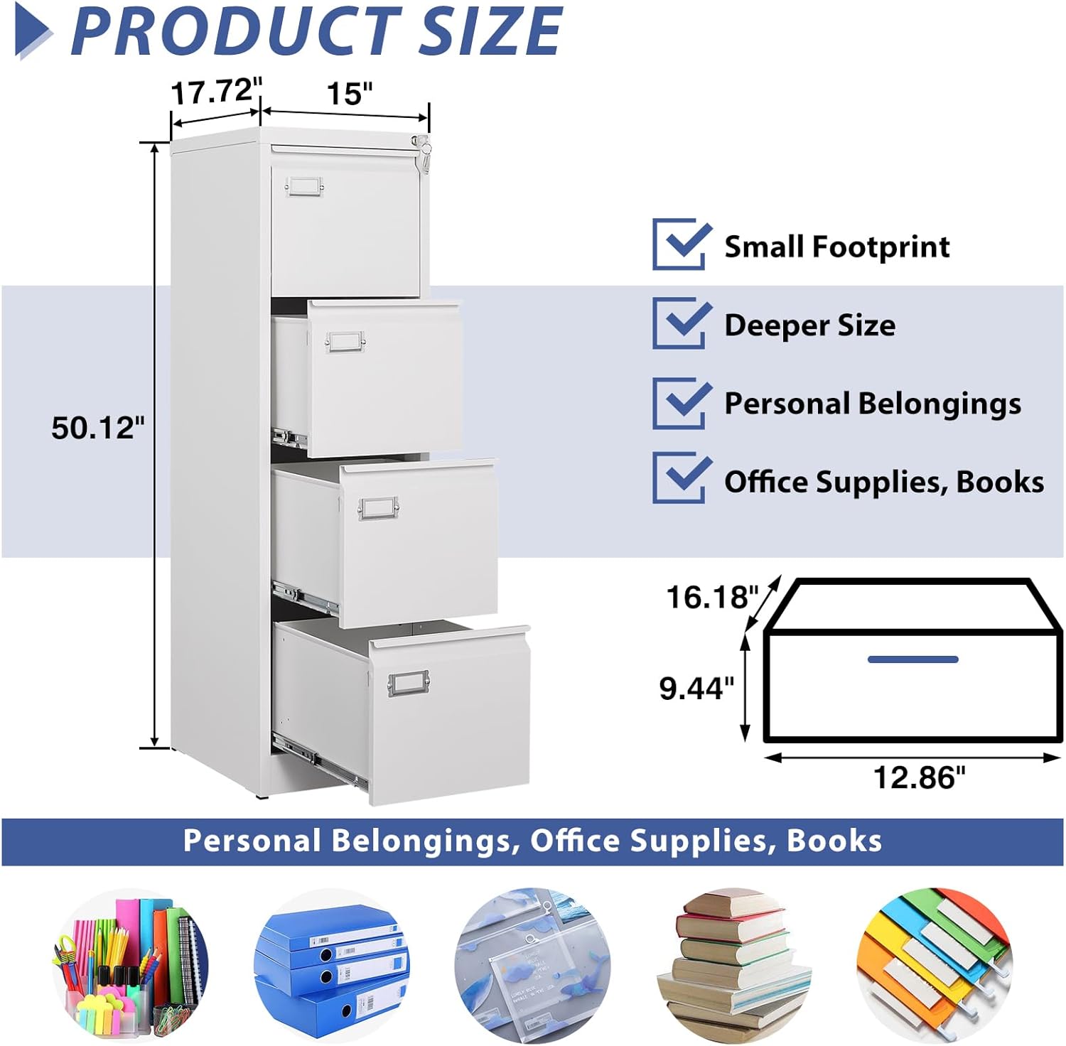 4 Drawer File Cabinet, Filing Cabinets for Home Office, Metal Vertical File Storage Cabinet with Lock, Locking File Cabinet for A4 Legal/Letter, 15" W x 17.7" D x 50.1" H, Assembly Required